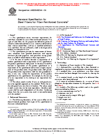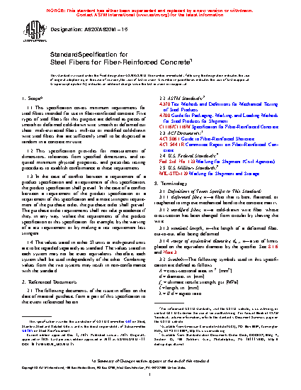 This specification covers steel fibers intended for use in fiber-reinforced concrete. The fibers shall be straight or deformed and of Types I (cold-drawn wire), II (cut sheet), III (melt-extracted), IV (mill cut), and V ( modified cold-drawn wire). Tensile and bend tests of randomly-selected finished fibers shall be performed. Measurement of dimensions shall be performed and values should conform to permissible variations of length, nominal length, diameter, equivalent diameter, aspect ratio, and nominal aspect ratio. Guidelines for inspection, rejection, rehearing, certification, and packaging are also given.