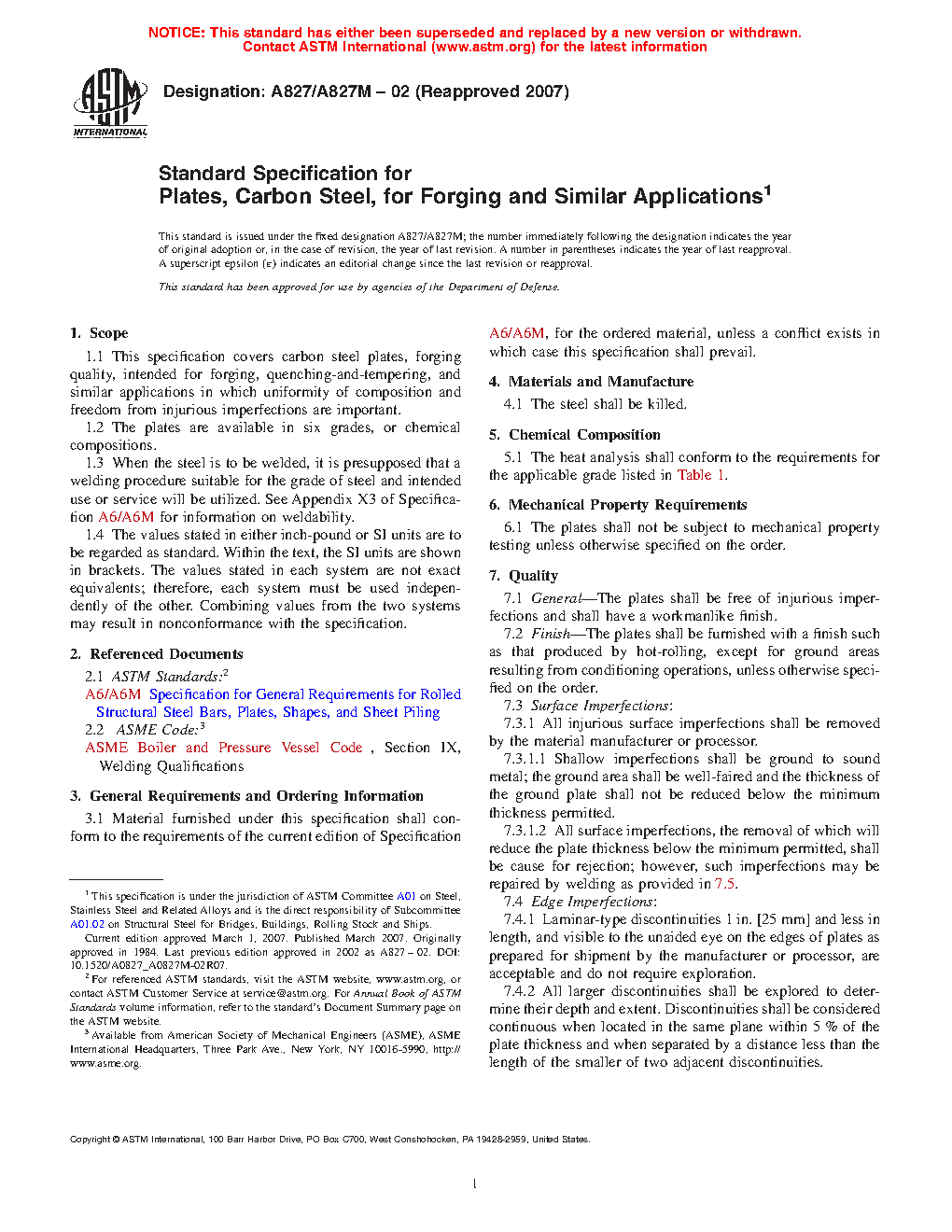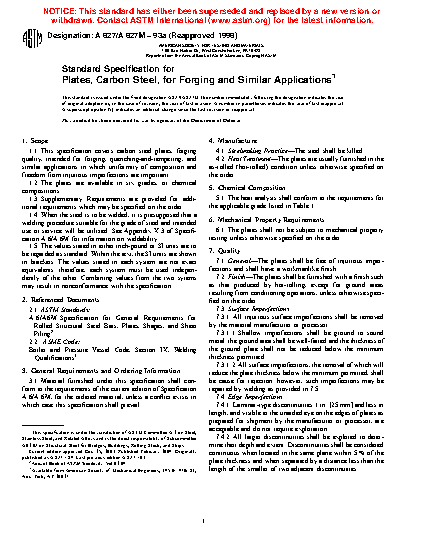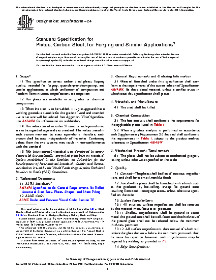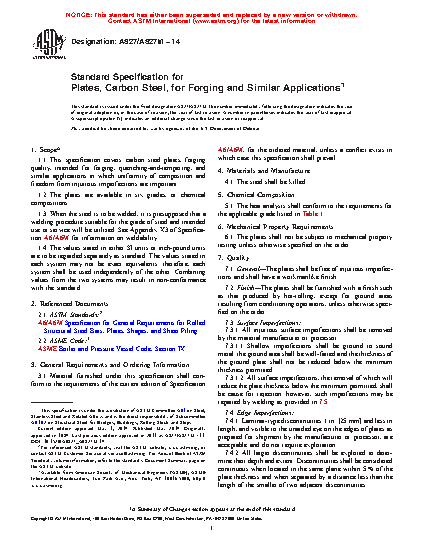 1.1 This specification covers carbon steel plates, forging quality, intended for forging, quenching-and-tempering, and similar applications in which uniformity of composition and freedom from injurious imperfections are important.