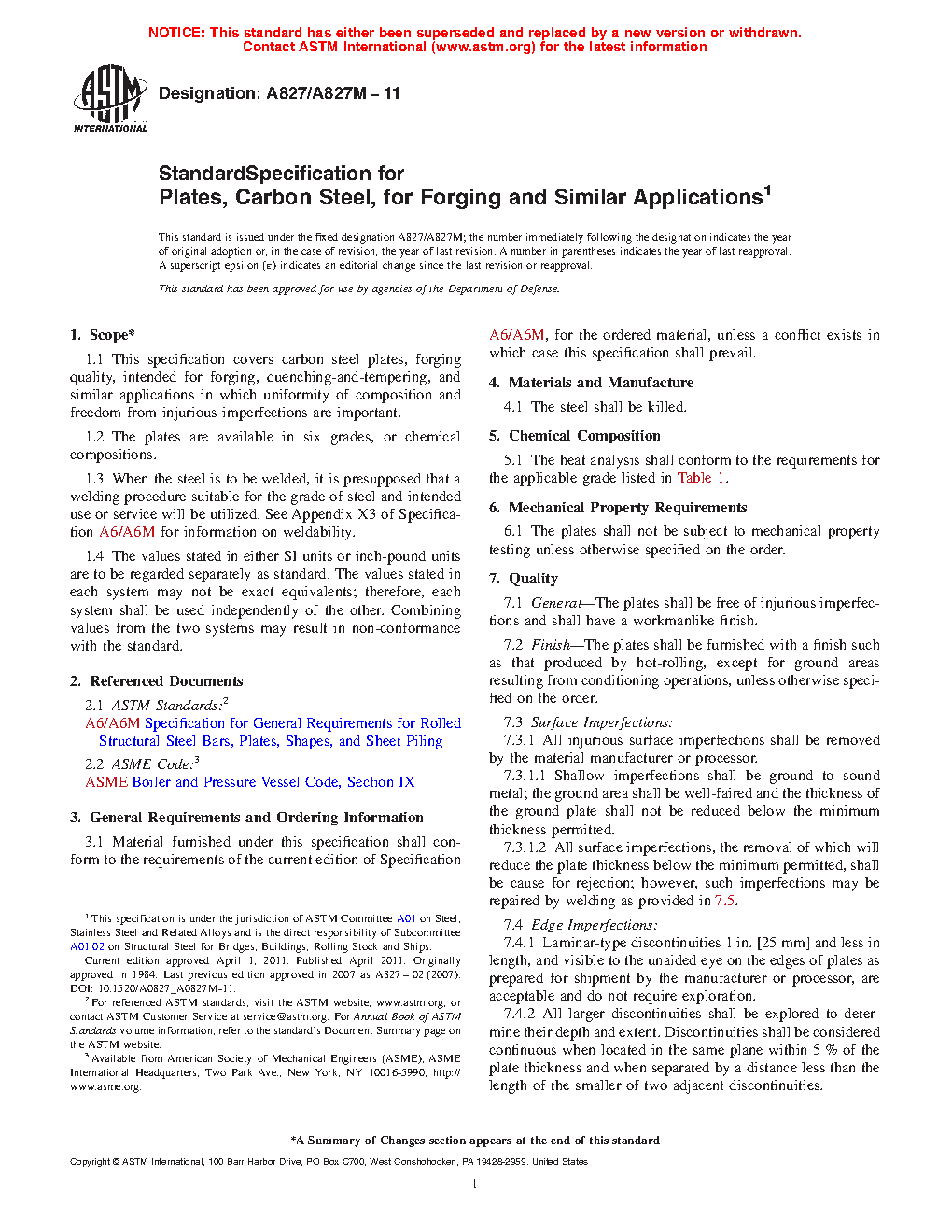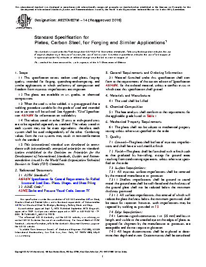This specification covers carbon steel plates, intended for forging, quenching-and-tempering, and similar applications in which uniformity of composition and freedom from injurious imperfections are important. Heat analysis of steel shall conform to the chemical requirements for carbon, manganese, phosphorus, sulfur, and silicon.