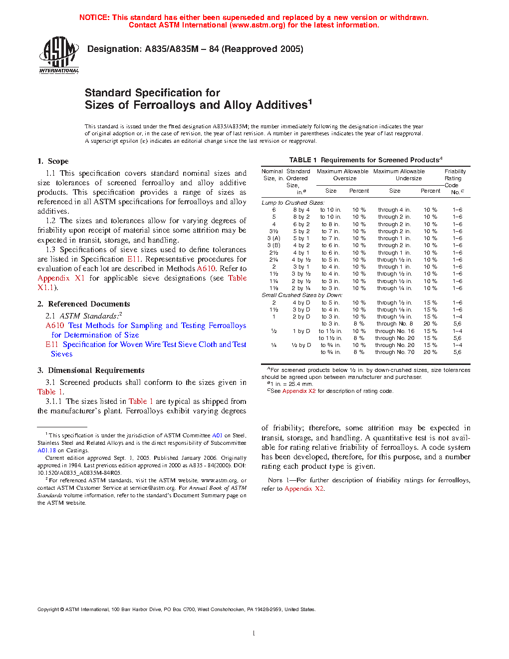 This specification covers standards for sizes of screened ferroalloys and alloy additives. Products shall conform to specified nominal size, standard ordered size, maximum allowable oversize, maximum allowable undersize, and friability rating. Description of the friability ratings of the ferroalloys is also provided.