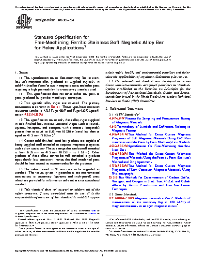 This specification covers nominally 17.5% Cr free-machining ferritic stainless soft magnetic alloy produced or supplied expressly in cold-finished bar form for use in magnetic cores and other parts requiring a corrosion-resistant, high permeability, low-coercivity steel. This specification does not cover either cast parts or parts produced by powder metallurgy techniques. Two specific alloy types are covered distinguished by different silicon levels. Required measurements include chemical analysis and dc magnetic property measurement. The magnetic properties depend both on the grade and the dimensions. Apart from the requirements, the specification contains useful appendices discussing the magnetic testing of these alloys and typical magnetic and physical properties.