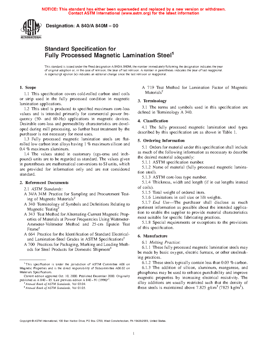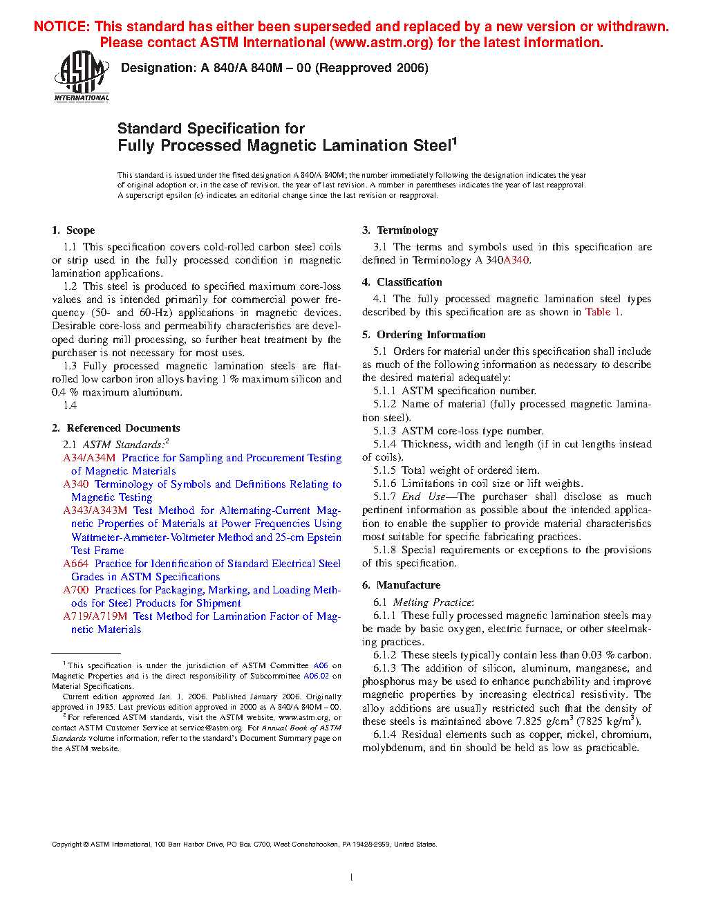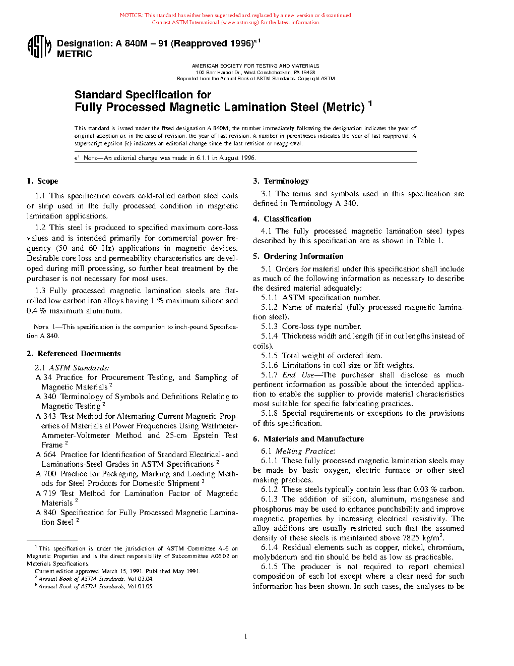 Standard Specification for Fully Processed Magnetic Lamination Steel