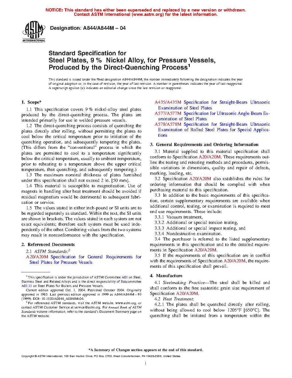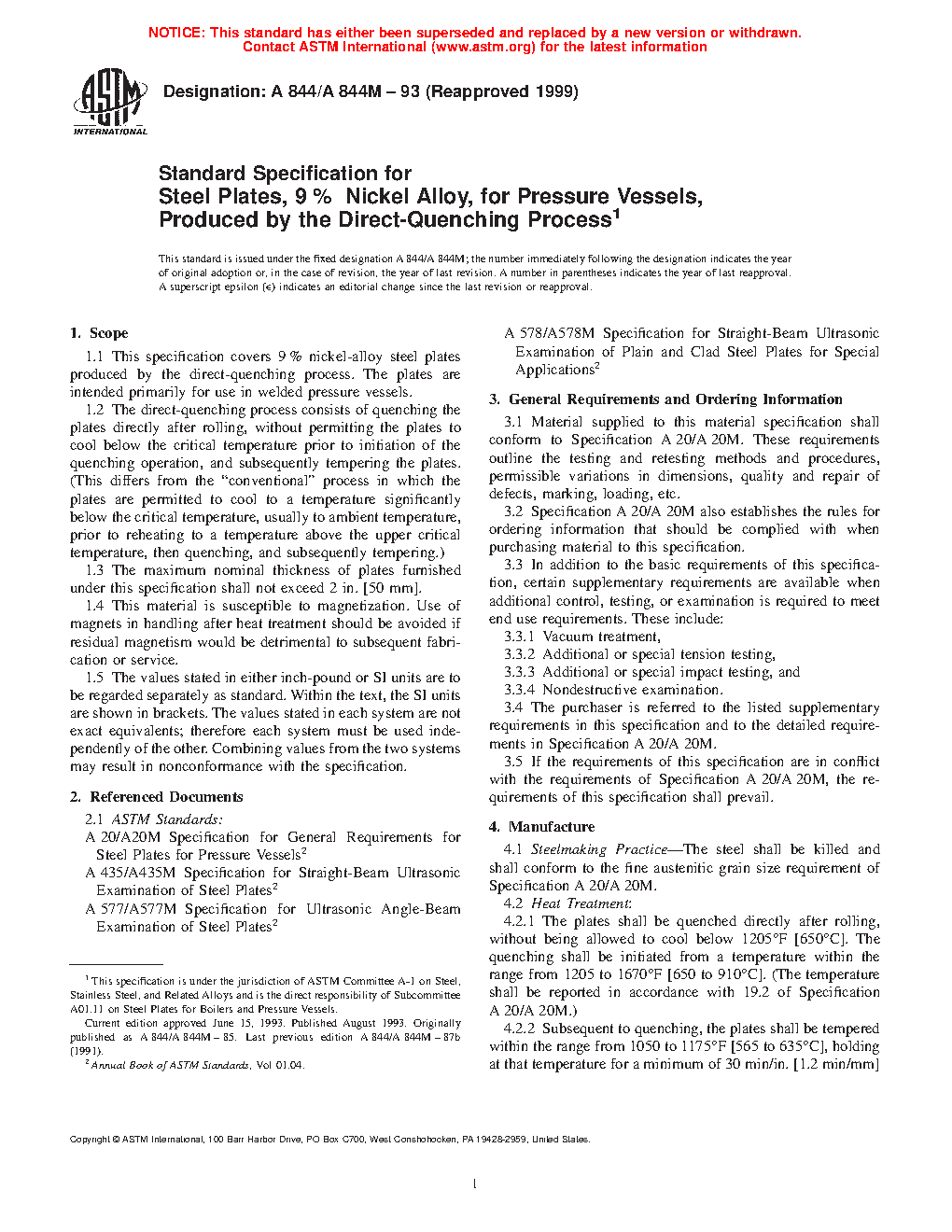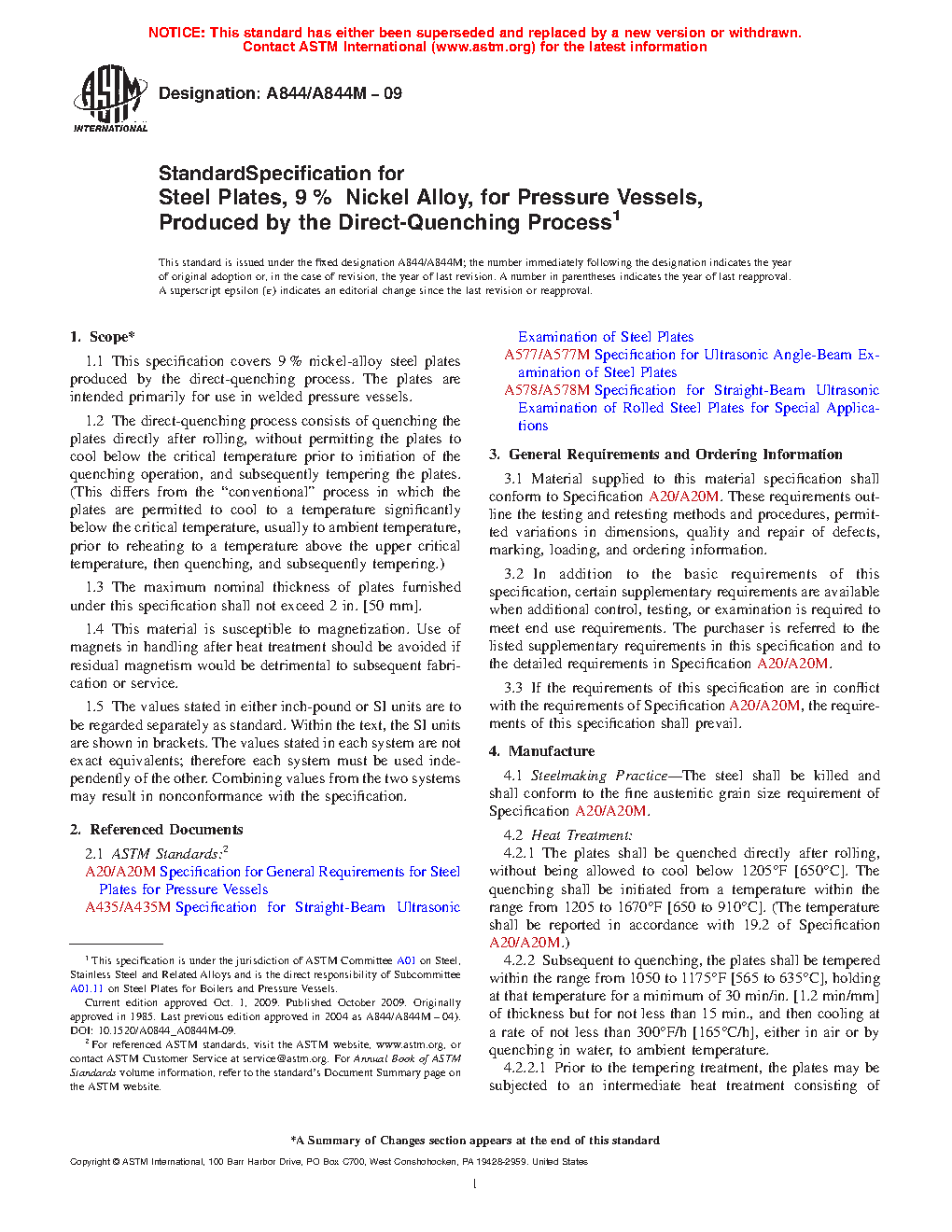 This specification covers 9% nickel-alloy steel plates produced by the direct-quenching process. The plates are intended primarily for use in welded pressure vessels. The steel shall be killed and shall conform to the fine austenitic grain size requirement specified. The steel shall conform to the chemical requirements specified. Tension test and impact test shall be made to conform to the requirements specified.