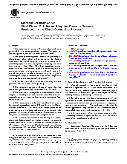 1.1 This specification covers 9 % nickel-alloy steel plates produced by the direct-quenching process. The plates are intended primarily for use in welded pressure vessels.