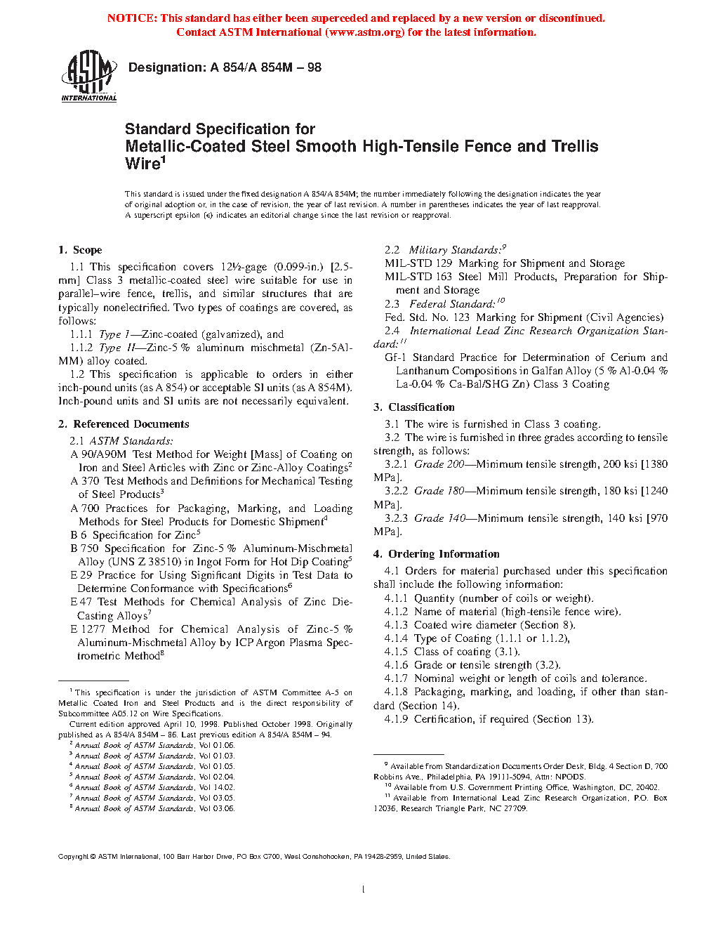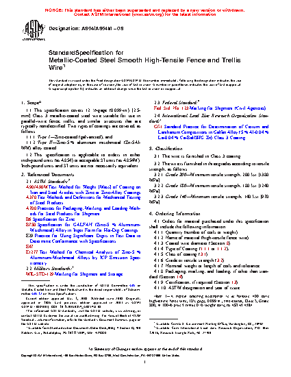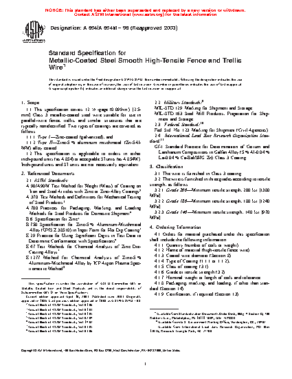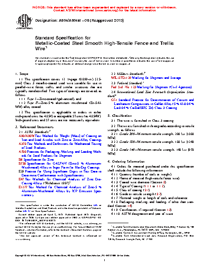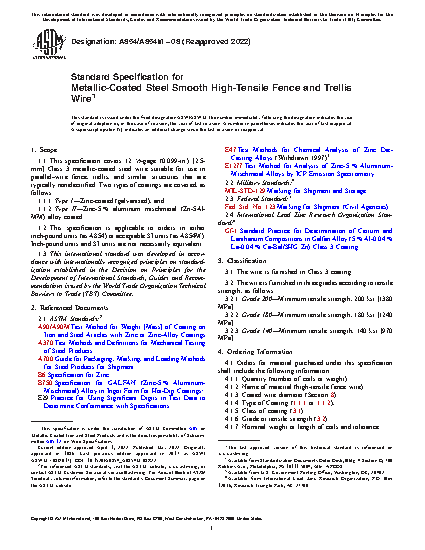 1.1 This specification covers 12 1/2-gage (0.099-in.) [2.5-mm] Class 3 metallic-coated steel wire suitable for use in parallel–wire fence, trellis, and similar structures that are typically nonelectrified. Two types of coatings are covered, as follows: