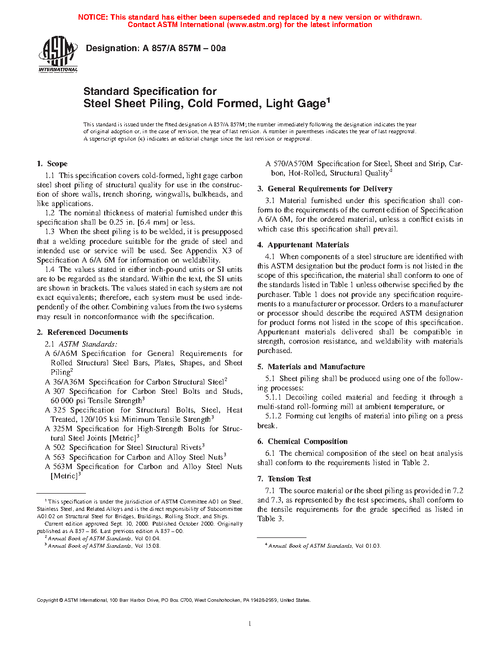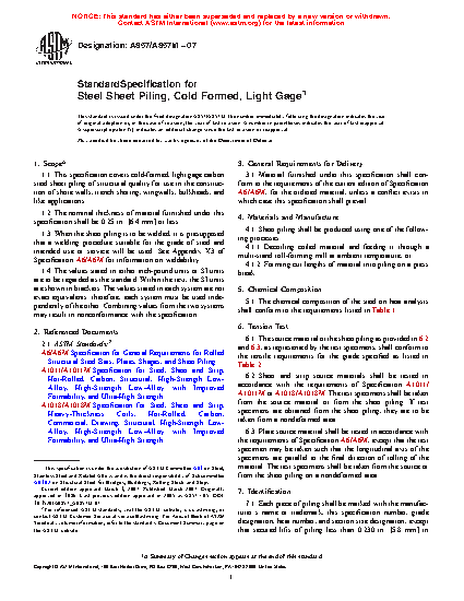 This specification covers cold-formed, light gage carbon steel sheet piling for use in the construction of shore walls, trench shoring, wingwalls, and bulkheads. Heat analysis shall be done wherein the carbon steel sheet shall conform to the required chemical composition for carbon, manganese, phosphorus, sulfur, and copper. Sheet and strip source materials shall undergo the tension test and conform with the specified tensile values of yield point, tensile strength, and elongation.