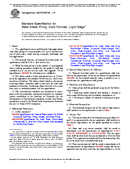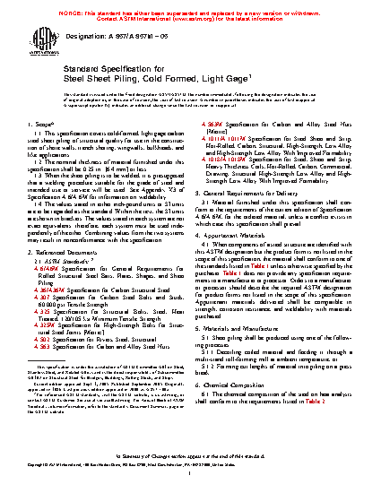1.1 This specification covers cold-formed, light gage carbon steel sheet piling of structural quality for use in the construction of shore walls, trench shoring, wingwalls, bulkheads, and like applications.