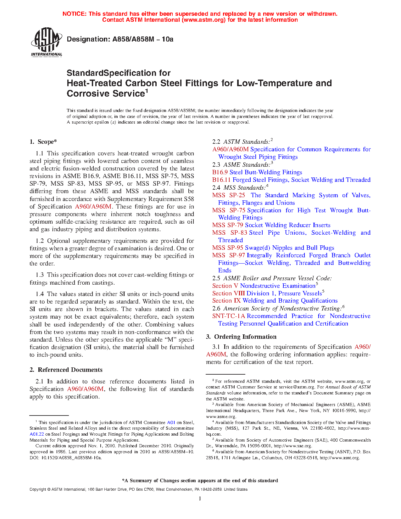 1.1 This specification covers heat-treated wrought carbon steel piping fittings with lowered carbon content of seamless and electric fusion-welded construction covered by the latest revisions in ASME B16.9, ASME B16.11, MSS SP-75, MSS SP-79, MSS SP-83, MSS SP-95, or MSS SP-97. Fittings differing from these ASME and MSS standards shall be furnished in accordance with Supplementary Requirement S58 of Specification A960/A960M. These fittings are for use in pressure components where inherent notch toughness and optimum sulfide-cracking resistance are required, such as oil and gas industry piping and distribution systems.