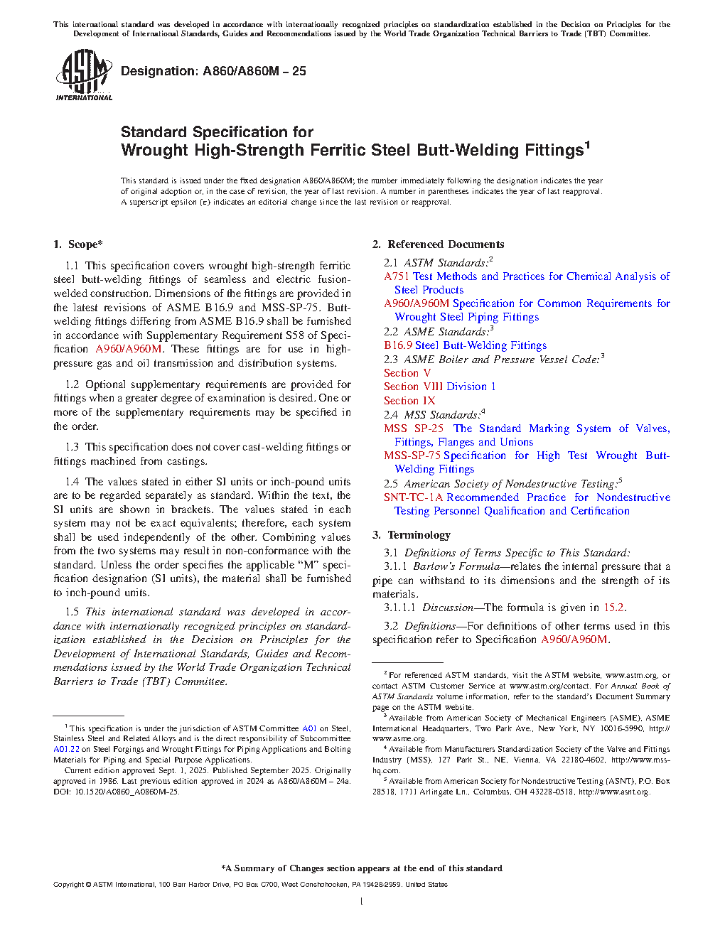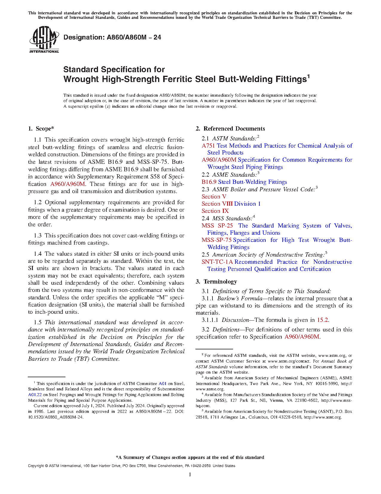 1.1 This specification covers wrought high-strength ferritic steel butt-welding fittings of seamless and electric fusion-welded construction covered by the latest revisions of ASME B16.9 and MSS-SP-75. Butt-welding fittings differing from these ASME and MSS standards shall be furnished in accordance with Supplementary Requirement S58 of Specification A 960/A 960M