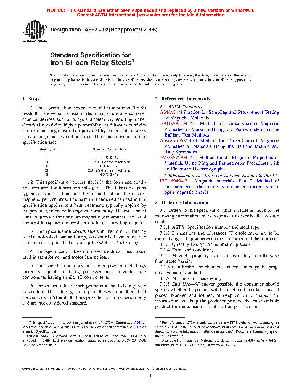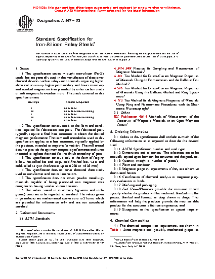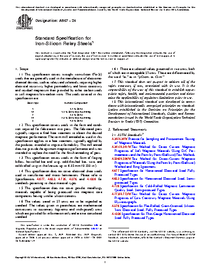 This specification covers wrought iron-silicon (Fe-Si) relay steels that are generally used in the manufacture of electromechanical devices, such as relays and solenoids, requiring higher electrical resistivity, higher permeability, and lower coercivity and residual magnetism than provided by either carbon steels or soft magnetic low-carbon irons. Available forms and conditions are forging billet, hot-rolled product, cold-finished bars, strip, and wire. These steels are not the same as the flat-rolled non-oriented or grain oriented iron-silicon electrical steels covered by ASTM Specifications A 677, A 683 and A 876. The steels covered in this specification have nominal silicon contents of 1.1, 2.3 and 4.0 % Si. Both the 1.1 and 2.3 % Si types are also available in an enhanced machinability composition. Along with chemical composition, steels produced to this specification must meet a specified maximum value of coercive field strength when heat treated according to this specification. Appendices are given containing typical magnetic, physical and mechanical properties and heat treatment.