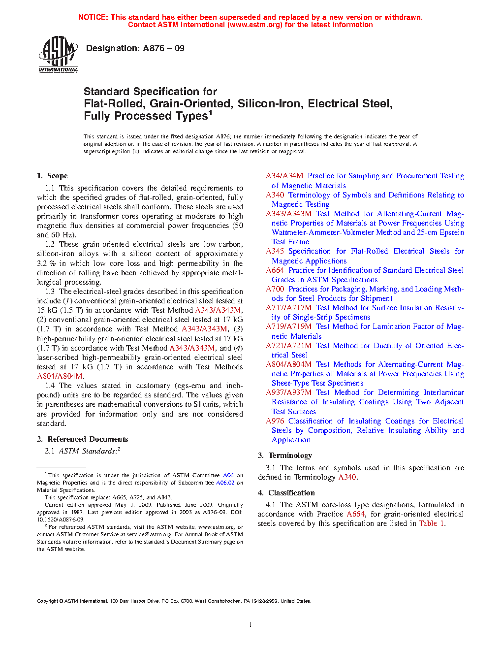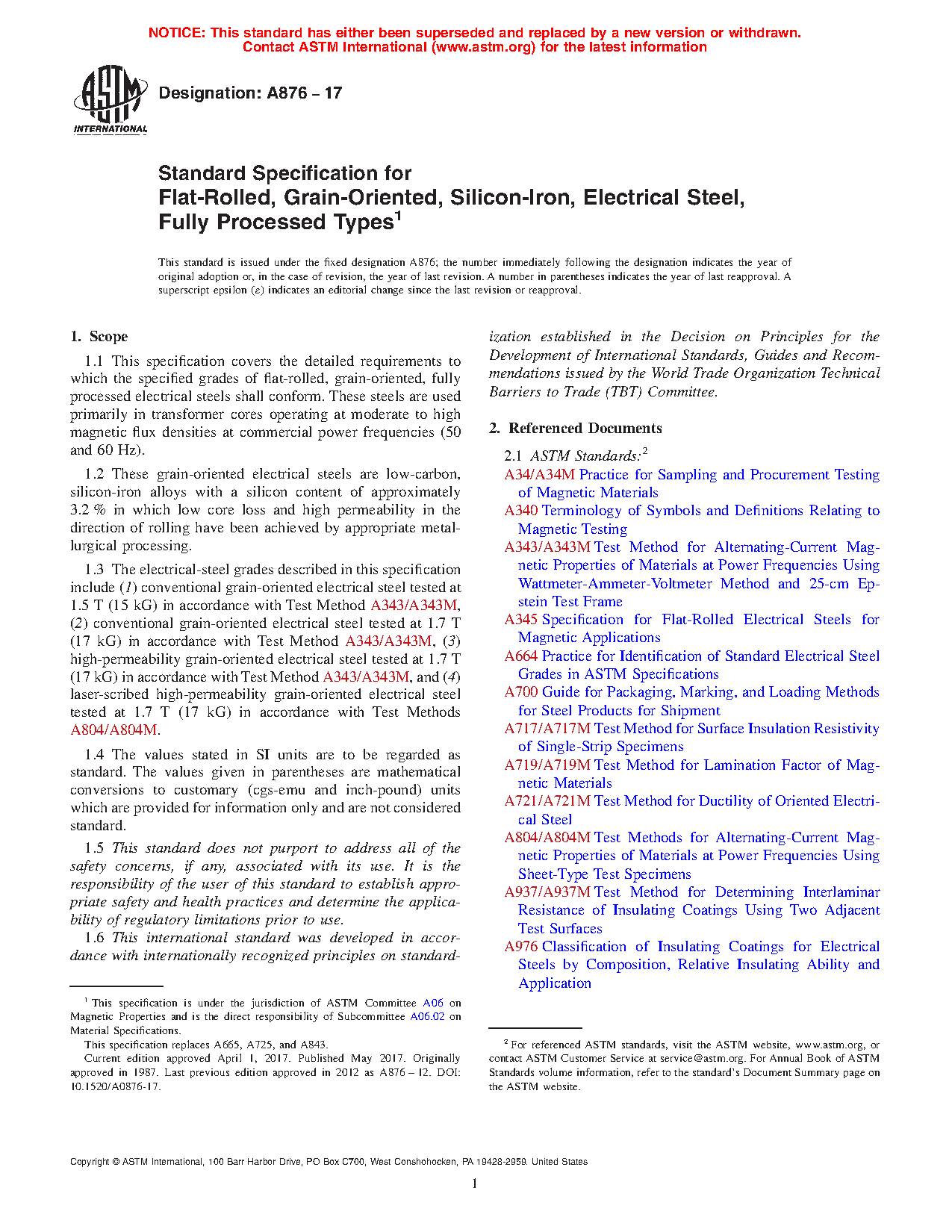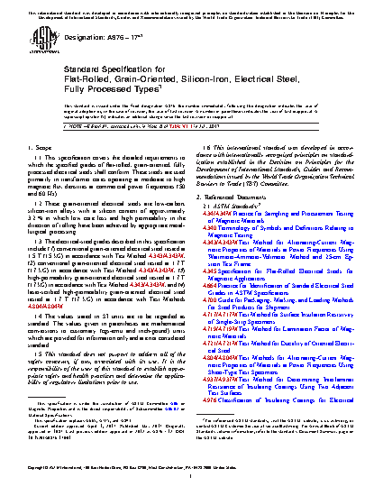 This specification covers the detailed requirements for specified grades of flat-rolled, grain-oriented, fully processed low-carbon silicon-iron electrical steels, whose low core loss and high permeability in the direction of rolling have been achieved by appropriate metallurgical processing. These steels are primarily used in transformer cores operating at moderate to high magnetic flux densities at commercial power frequencies. These steels may be acquired in any of four conditions a.) conventional grain-oriented tested at 15 kG (1.5 T), b.) conventional grain-oriented tested at 17 kG (1.7 T), c.) high-permeability grain-oriented tested at 17 kG (1.7 T) and d.) laser-scribed high-permeability grain-oriented tested at 17 kG (1.7 T). These steels can be purchased in a number of combinations of material form and surface type or treatment. This specification explains in detail, the available forms, thicknesses and magnetic performance.