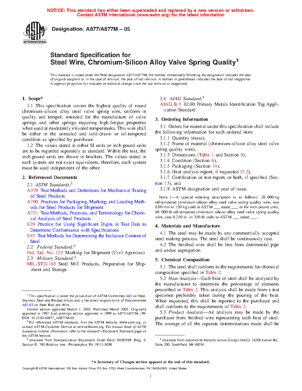 This specification covers the highest quality of round chromium-silicon alloy steel valve spring wires, uniform in quality and temper, intended for the manufacture of valve springs and other springs requiring high-fatigue properties when used at moderately elevated temperatures. This wire shall be either in the annealed and cold-drawn or oil-tempered condition. The steel may be made by any commercially accepted steel making process, shall be continuously cast, and shall be free from detrimental pipe and undue segregation and surface imperfections. Heat analysis, tensile testing, wrap testing, and surface inspection by magnetic or eddy current defect analysis shall be done. Both heat and product analysis shall conform to the chemical composition requirements specified for carbon, manganese, phosphorus, sulfur, silicon, and chromium. The mechanical requirements for the steel wire including cooling, heat treatment, and tensile strength, and the metallurgical requirements including etched surface testing, decarburization, and inclusion content are detailed.