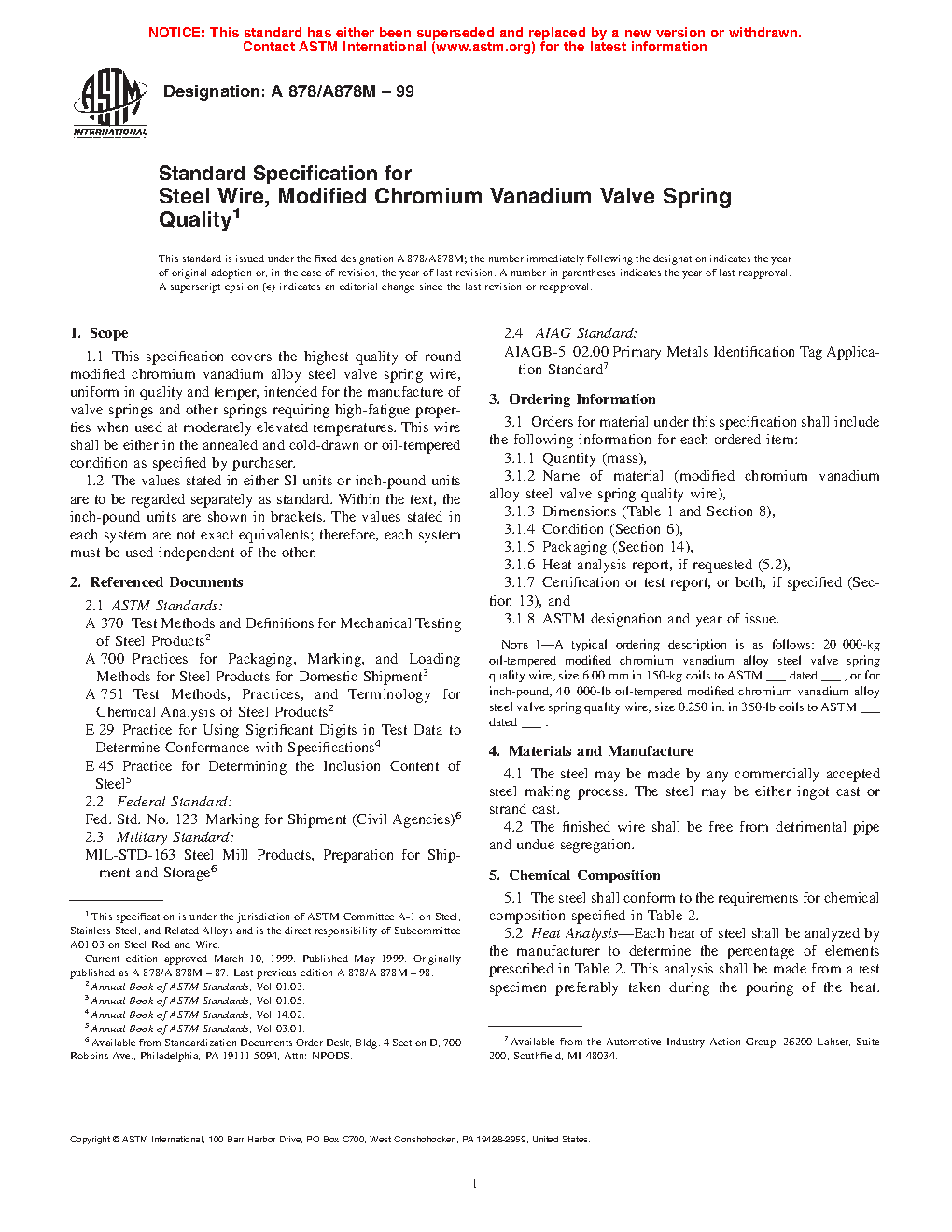 1.1 This specification covers the highest quality of round modified chromium vanadium alloy steel valve spring wire, uniform in quality and temper, intended for the manufacture of valve springs and other springs requiring high-fatigue properties when used at moderately elevated temperatures. This wire shall be either in the annealed and cold-drawn or oil-tempered condition as specified by purchaser.