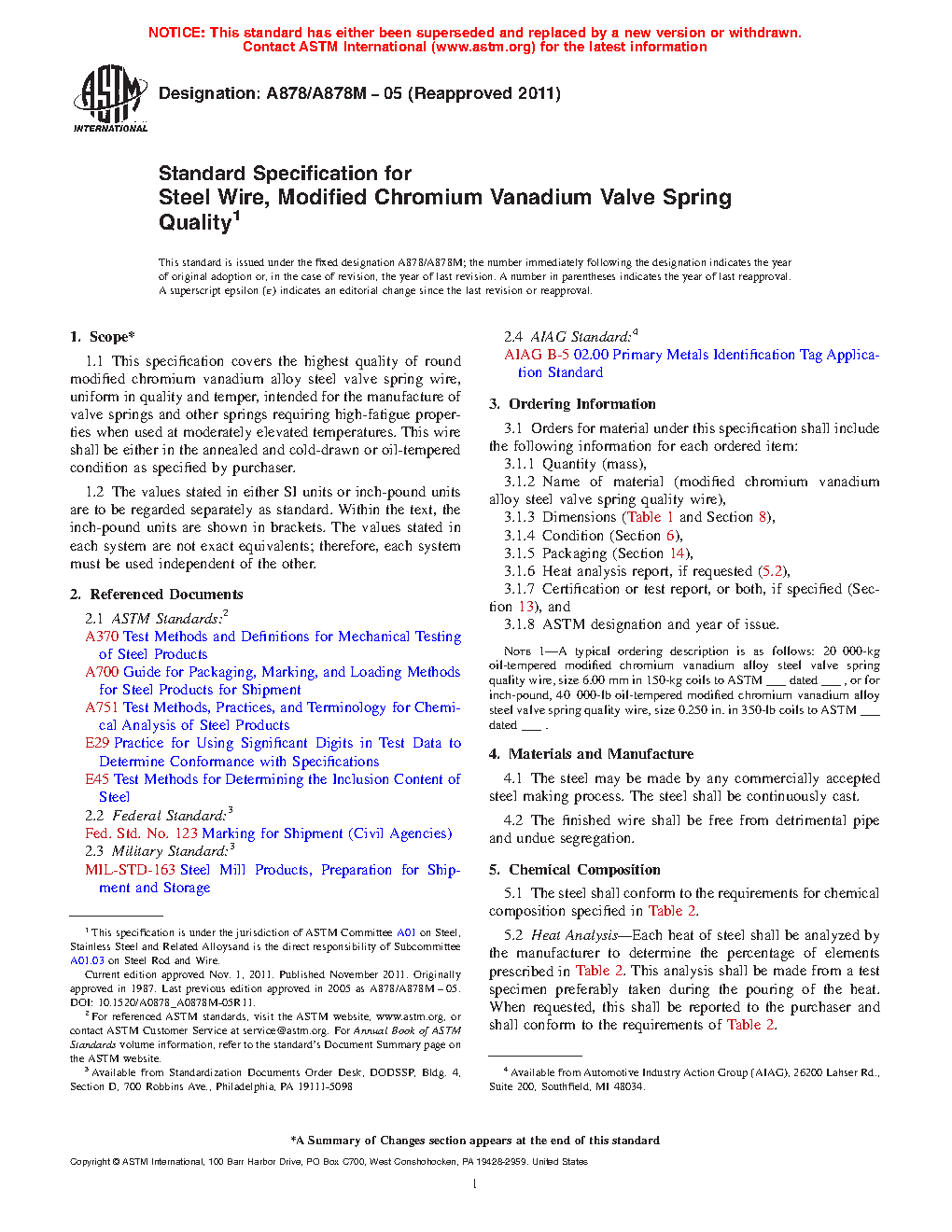 1.1 This specification covers the highest quality of round and shaped modified chromium vanadium alloy steel valve spring wire, uniform in quality and temper, intended for the manufacture of valve springs and other springs requiring high-fatigue properties when used at moderately elevated temperatures. It is similar to the grade VD (referenced in EN 10270-2) intended for high fatigue levels. This wire shall be either in the annealed and cold-drawn or quenched and tempered condition as specified by purchaser.