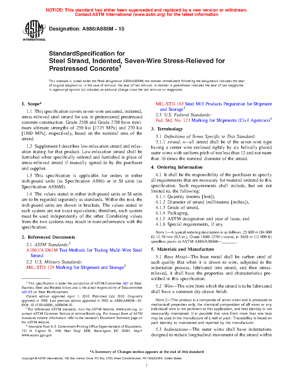 This specification covers seven-wire uncoated, indented, stress-relieved carbon steel strands for use in pre-stressed concrete construction. Wire dimensions, indentations, and mechanical properties shall be in accordance to the values specified in this specification. The carbon steel strand is produced to satisfy only the specified mechanical properties, this specification contains no information on the chemical composition of the wires.