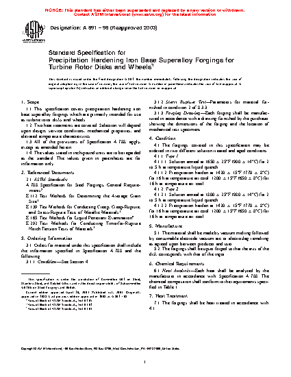 Standard Specification for Precipitation Hardening Iron Base Superalloy Forgings for Turbine Rotor Disks and Wheels