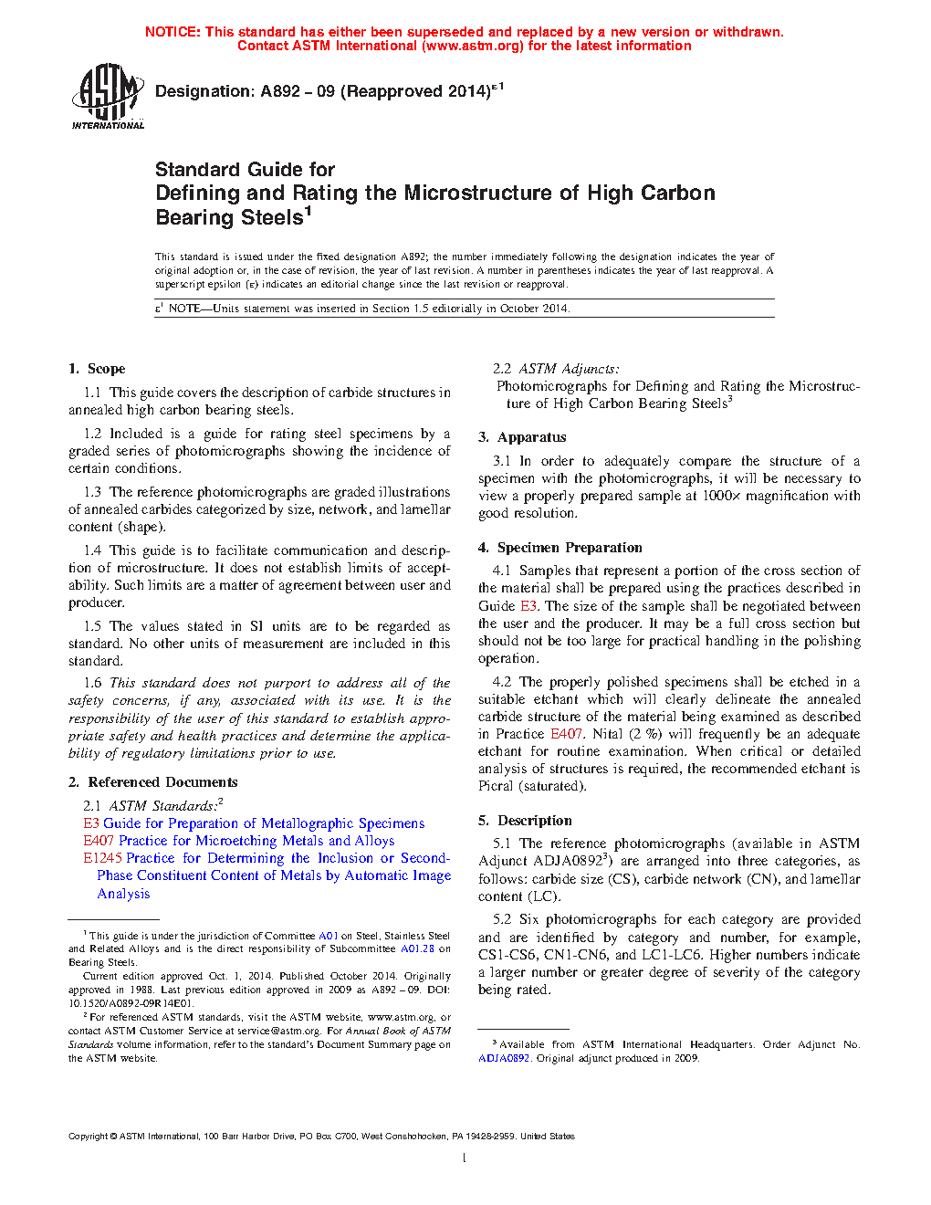This guide covers the definition and rating of the microstructure of carbide structures in annealed high carbon bearing steels. Requirements for the optical metallograph apparatus and specimen preparation including polishing and etching are detailed. The description of the reference photomicrographs (graded illustrations of annealed carbides categorized by size, network, and lamellar content (shape)) that shall be used in the evaluation and the equation that shall define the rating are given.