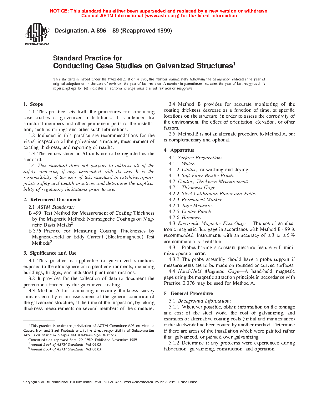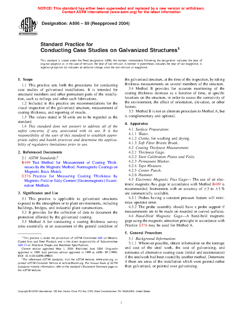 1.1 This practice sets forth the procedures for conducting case studies of galvanized installations. It is intended for structural members and other permanent parts of the installation, such as railings and other such fabrications.