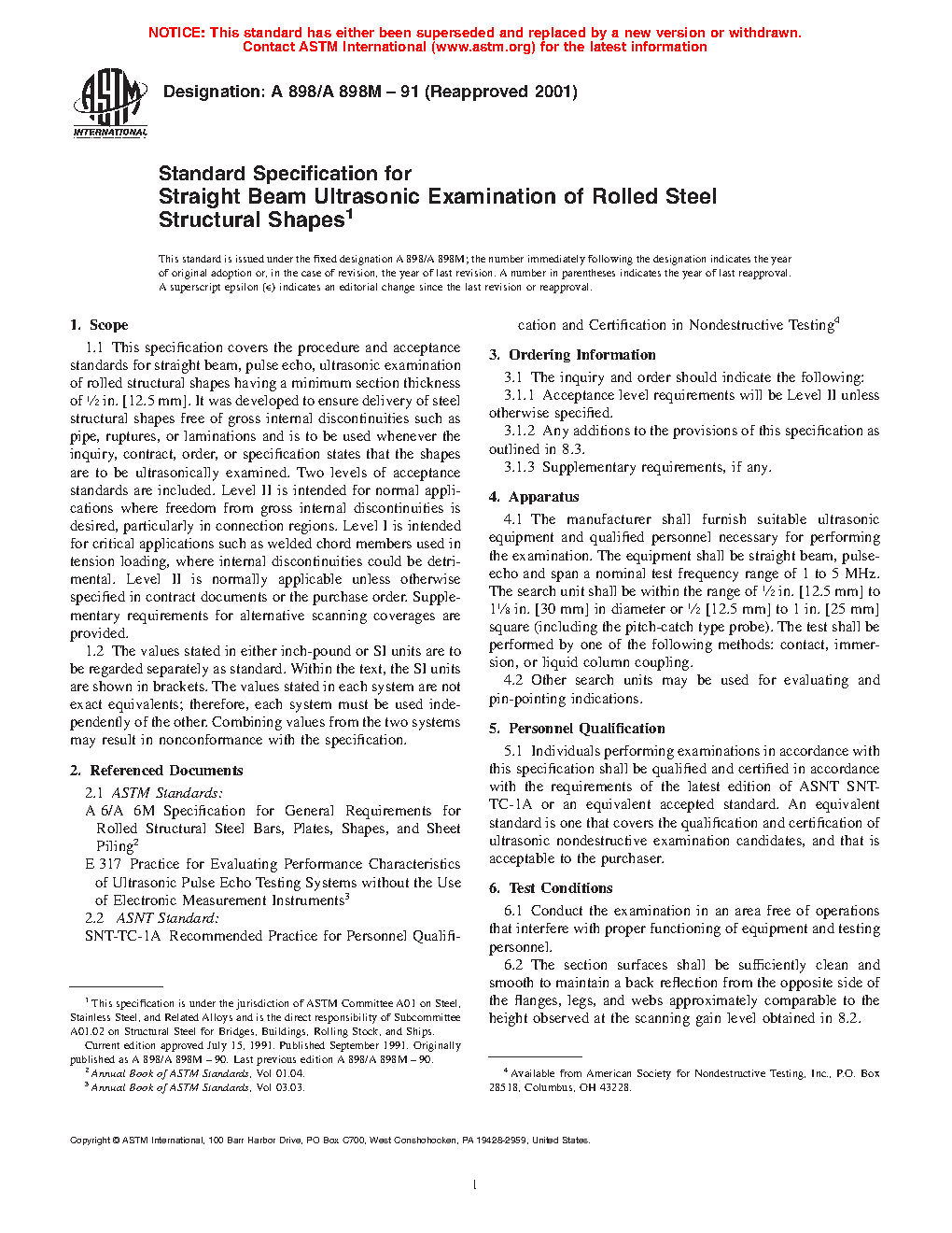 1.1 This specification covers the procedure and acceptance standards for straight beam, pulse echo, ultrasonic examination of rolled structural shapes having a minimum section thickness of ½ in. [12.5 mm]. It was developed to ensure delivery of steel structural shapes free of gross internal discontinuities such as pipe, ruptures, or laminations and is to be used whenever the inquiry, contract, order, or specification states that the shapes are to be ultrasonically examined. Two levels of acceptance standards are included. Level II is intended for normal applications where freedom from gross internal discontinuities is desired, particularly in connection regions. Level I is intended for critical applications such as welded chord members used in tension loading, where internal discontinuities could be detrimental. Level II is normally applicable unless otherwise specified in contract documents or the purchase order. Supplementary requirements for alternative scanning coverages are provided.