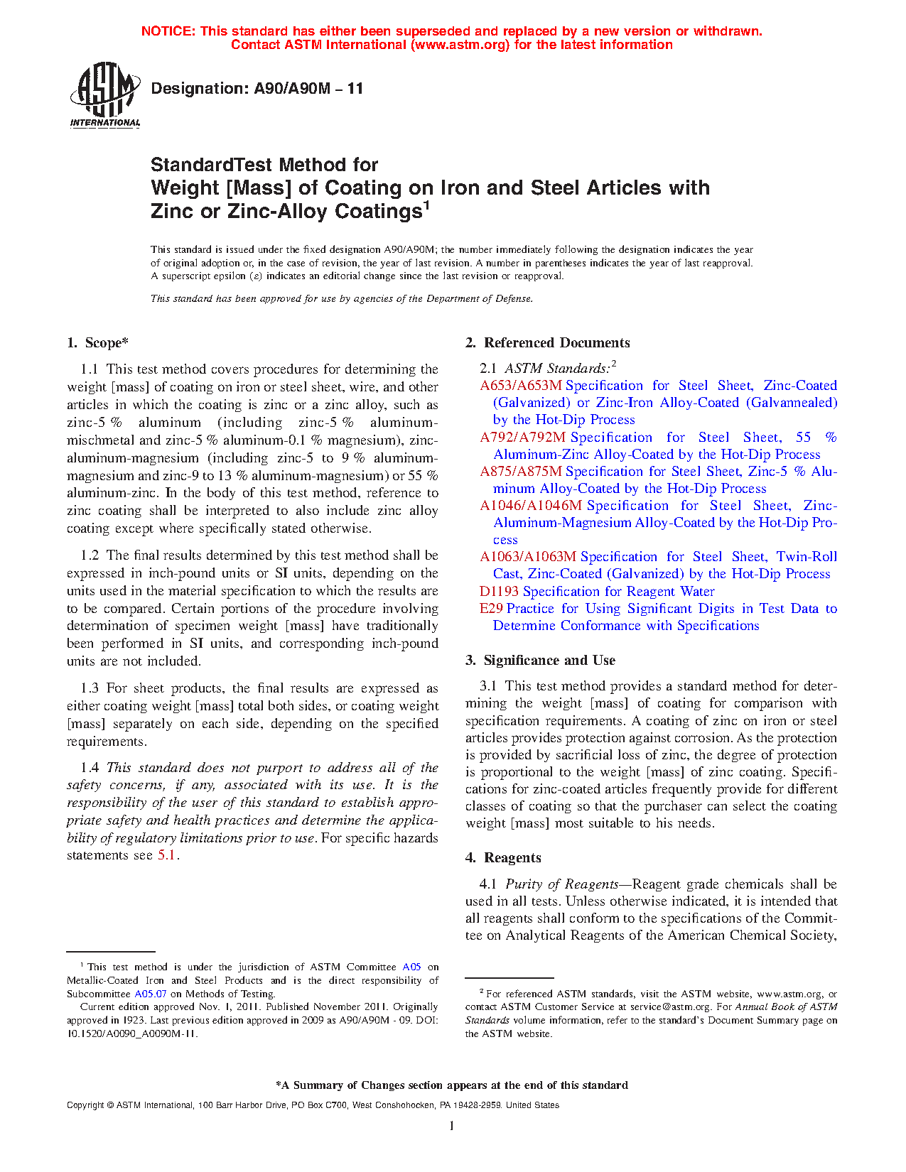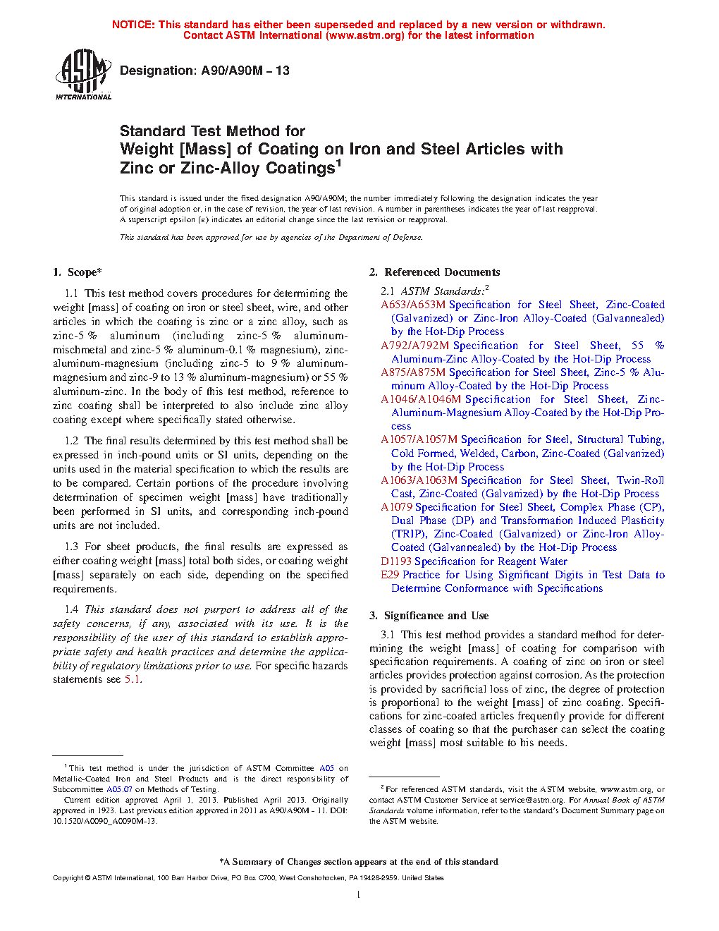 This test method provides a standard method for determining the weight [mass] of coating for comparison with specification requirements. A coating of zinc on iron or steel articles provides protection against corrosion. As the protection is provided by sacrificial loss of zinc, the degree of protection is proportional to the weight [mass] of zinc coating. Specifications for zinc-coated articles frequently provide for different classes of coating so that the purchaser can select the coating weight [mass] most suitable to his needs.