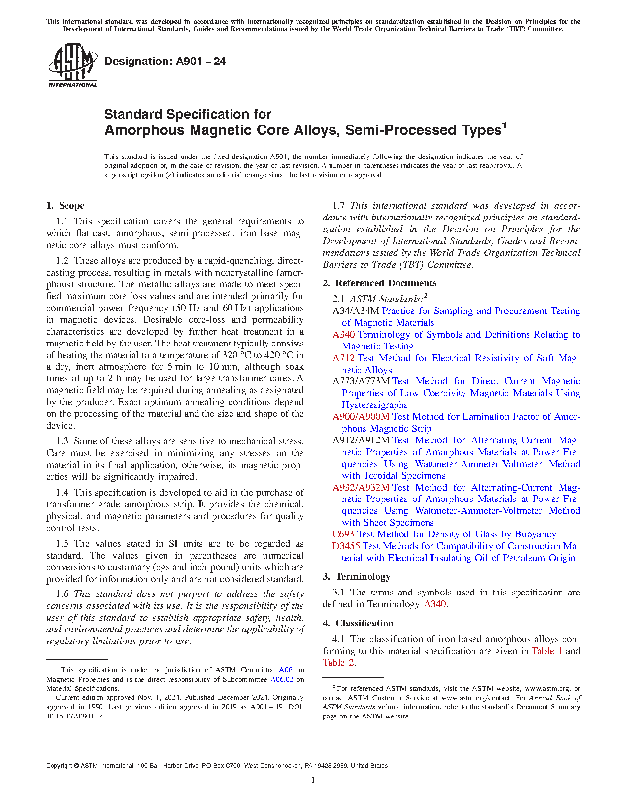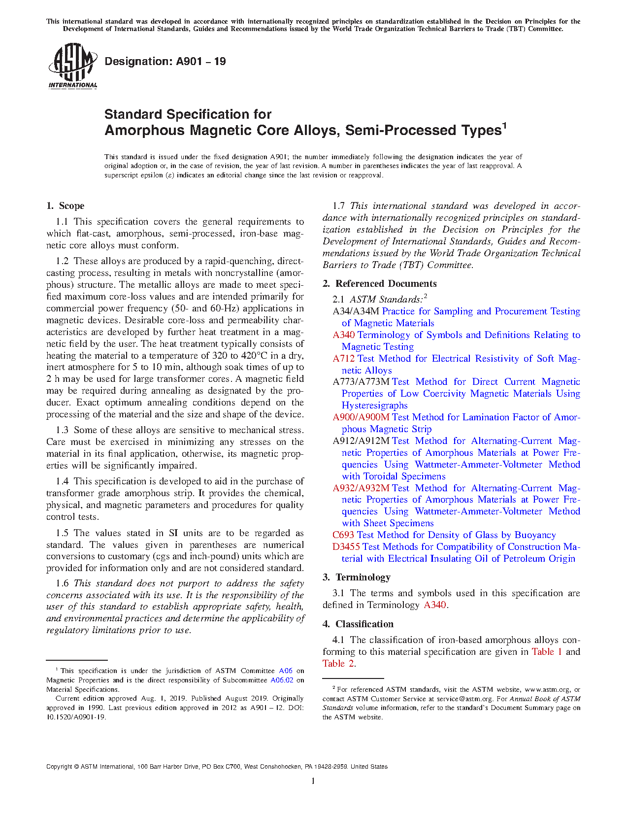 1.4 This specification is developed to aid in the purchase of transformer grade amorphous strip. It provides the chemical, physical, and magnetic parameters and procedures for quality control tests.