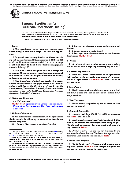 The specification covers austenitic, stainless steel, needle tubing in hard-drawn tempers for industrial application. An electric furnace or other similar primary melting process with or without degassing or refining may be used. Needle tubing shall be made by the seamless or welded and drawn process and shall be furnished in the hard-drawn temper condition. Tension tests shall be made to meet the required tensile requirements.
