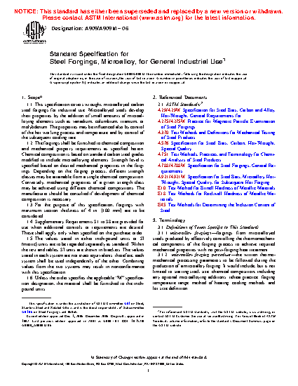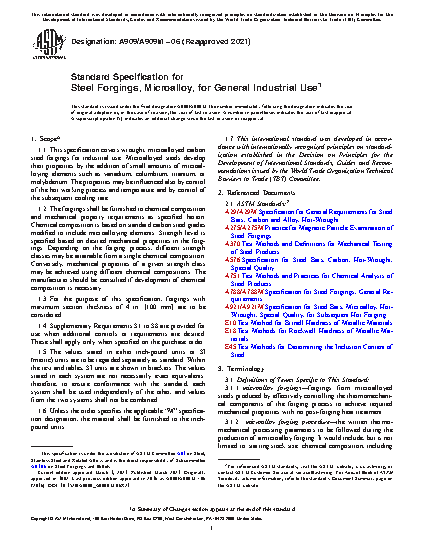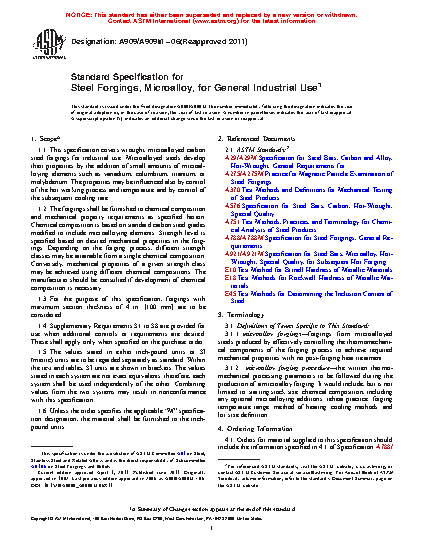 1.1 This specification covers wrought, microalloyed carbon steel forgings for industrial use. Microalloyed steels develop their properties by the addition of small amounts of microalloying elements such as vanadium, columbium, titanium, or molybdenum. The properties may be influenced also by control of the hot working process and temperature and by control of the subsequent cooling rate.