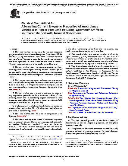 1.1 This test method covers tests for various magnetic properties of amorphous materials at power frequencies [25 Hz to 400 Hz] using a toroidal test transformer. The term “toroidal test transformer” is used to describe the test device, reserving the term “specimen” to refer to the material used in the test. The test specimen consists of toroidally wound flat strip.