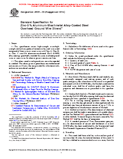 This guide covers standard specification for high-strength, extra-high-strength, and utilities grades of concentric lay steel wire strand composed of three wires or seven wires with Class A, Class B, or Class C zinc aluminum-mischmetal (Zn-5 Al-MM) alloy coatings specifically intended for use as overhead ground wires or static wires for electric power transmission lines. Alloy-coated steel wires, of varying sizes and grades of strand, shall conform to the specified values of the approximate weight per unit length of strand and the minimum breaking strength of the finished strand. The weight of the three classes of coating shall not be less than the specified value. The steel wires shall meet the required mechanical properties such as breaking strength, elongation, and ductility.