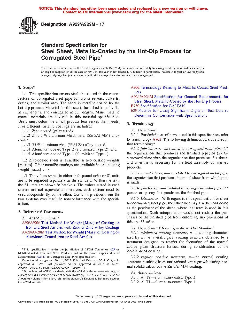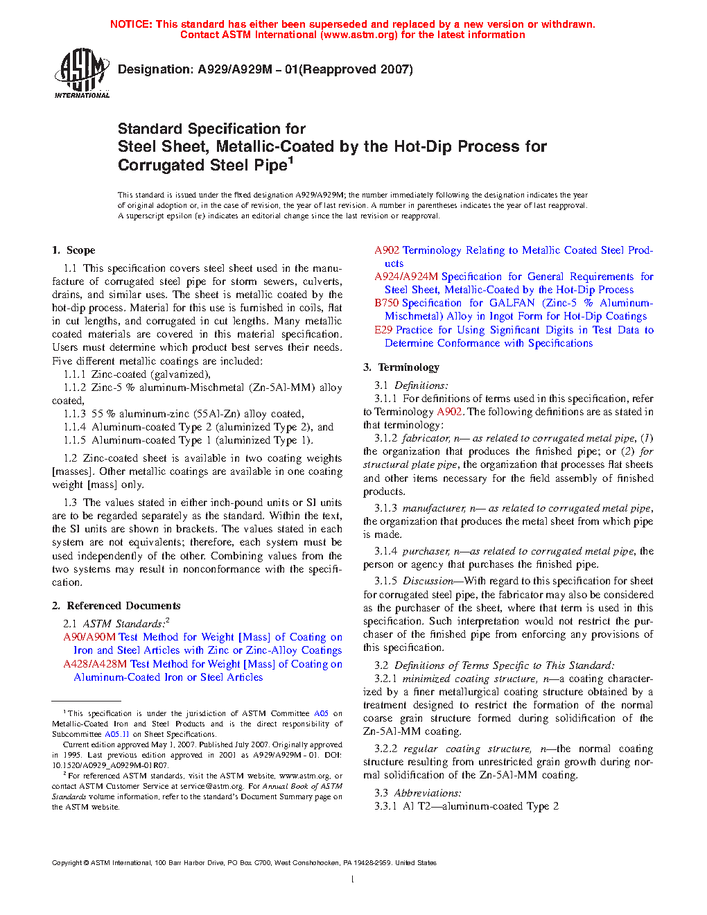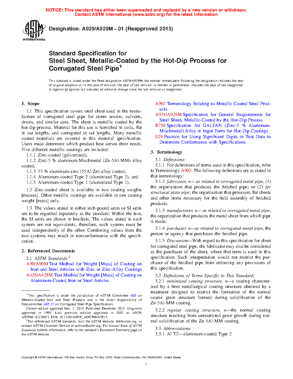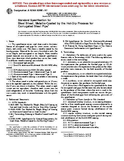 1.1 This specification covers steel sheet used in the manufacture of corrugated steel pipe for storm sewers, culverts, drains, and similar uses. The sheet is metallic coated by the hot-dip process. Material for this use is furnished in coils, flat in cut lengths, and corrugated in cut lengths. Many metallic coated materials are covered in this material specification. Users must determine which product best serves their needs. Five different metallic coatings are included: