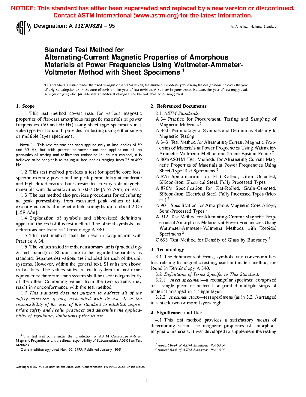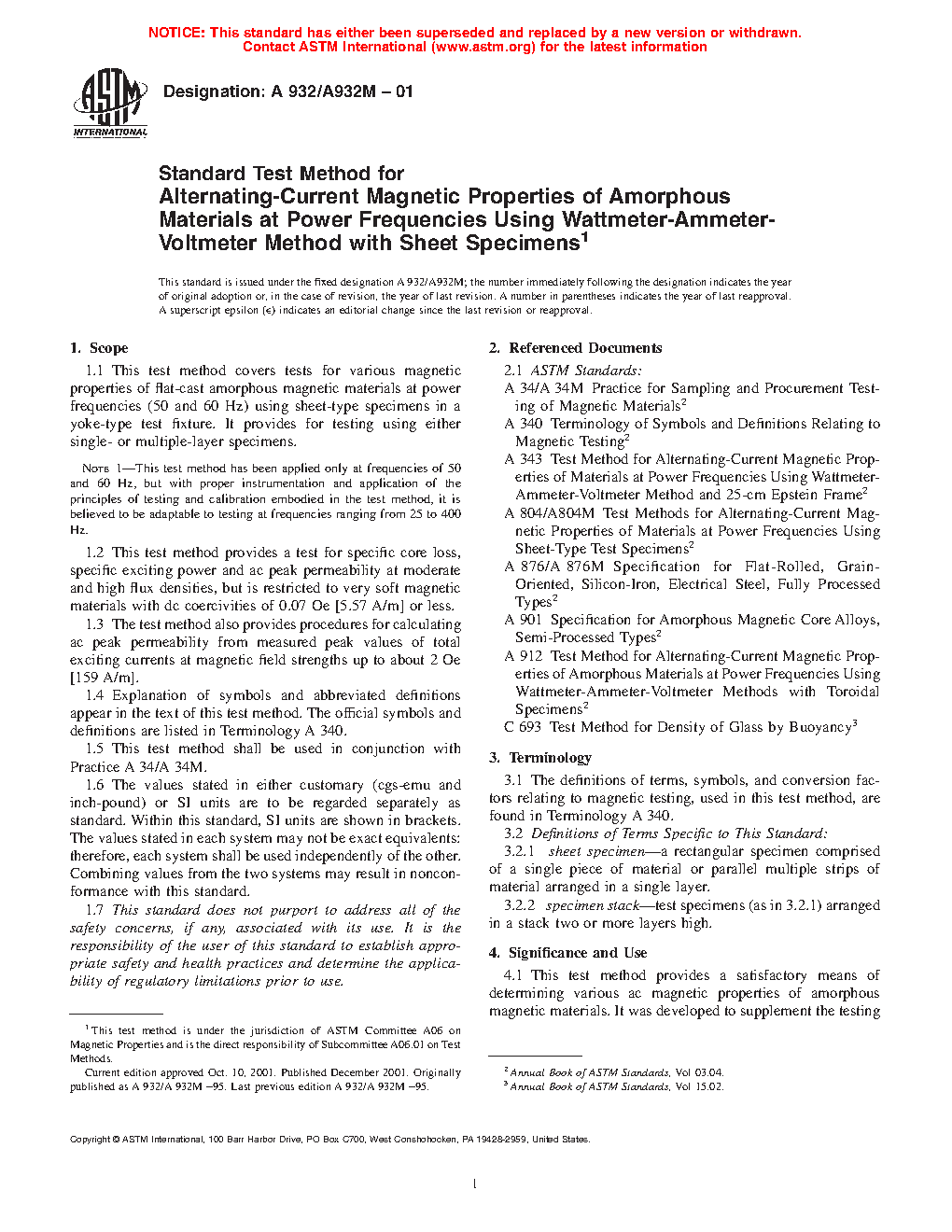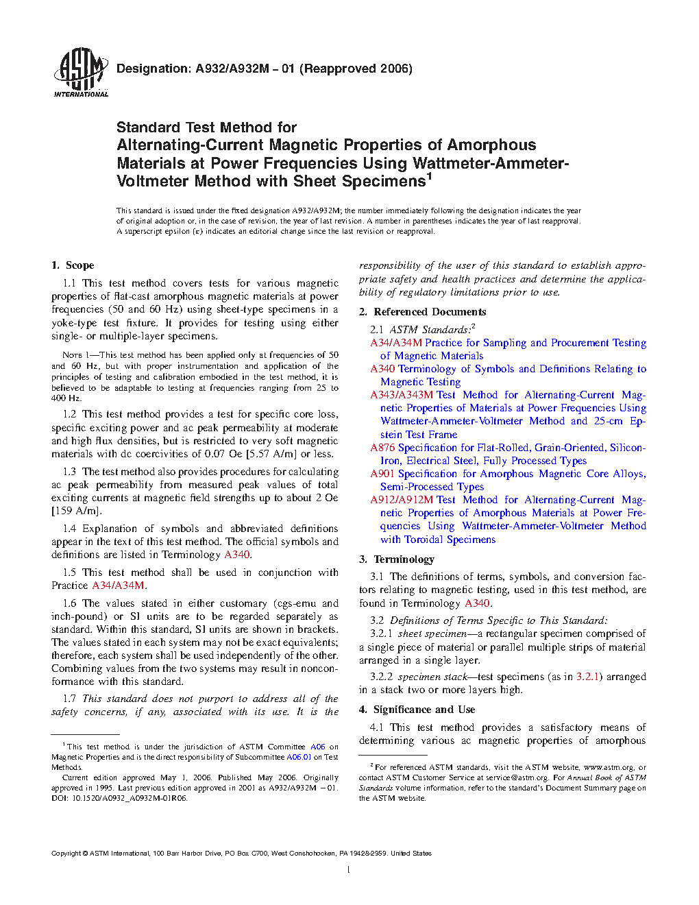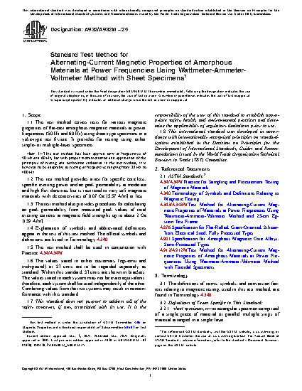 4.1 This test method provides a satisfactory means of determining various ac magnetic properties of amorphous magnetic materials. It was developed to supplement the testing of toroidal and Epstein specimens. For testing toroidal specimens of amorphous materials, refer to Test Method A912/A912M.