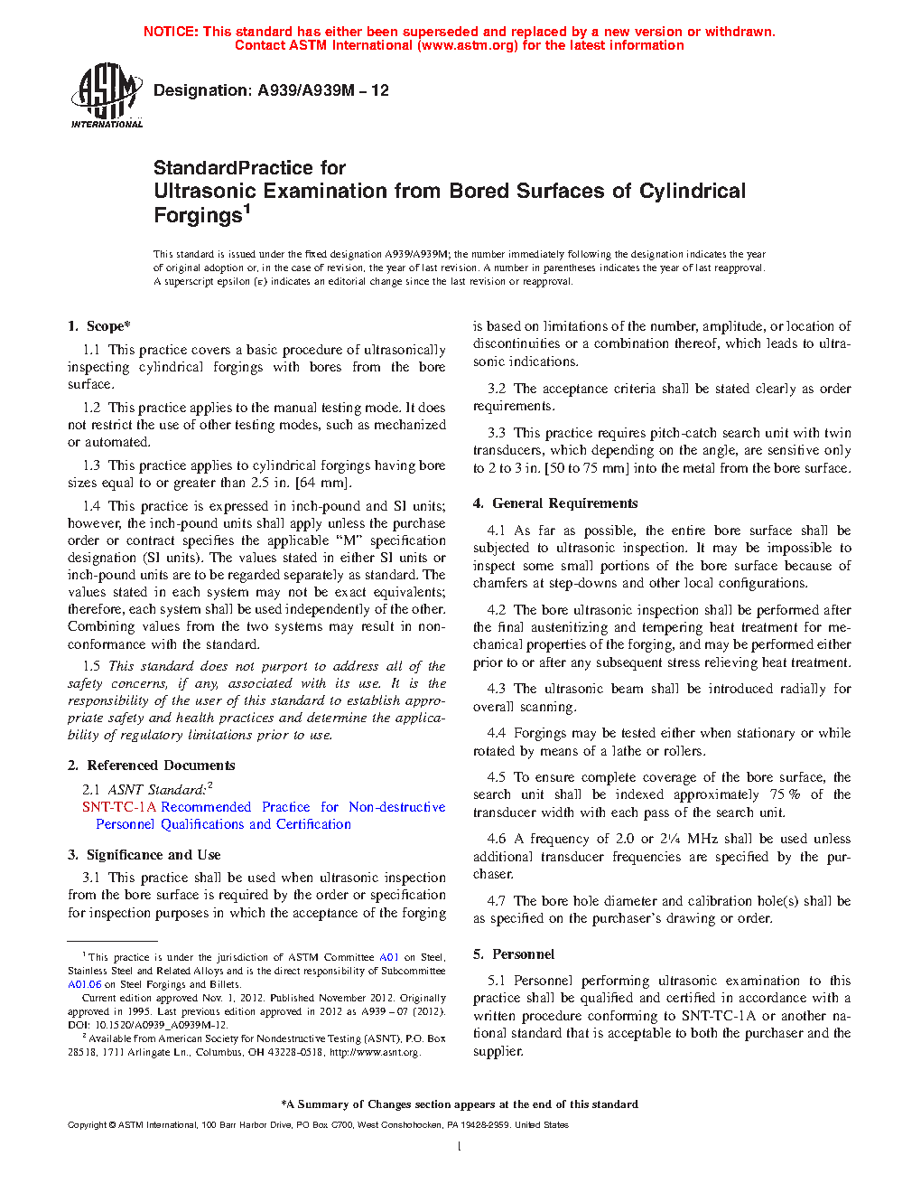 3.1 This practice shall be used when ultrasonic inspection from the bore surface is required by the order or specification for inspection purposes in which the acceptance of the forging is based on limitations of the number, amplitude, or location of discontinuities or a combination thereof, which leads to ultrasonic indications.