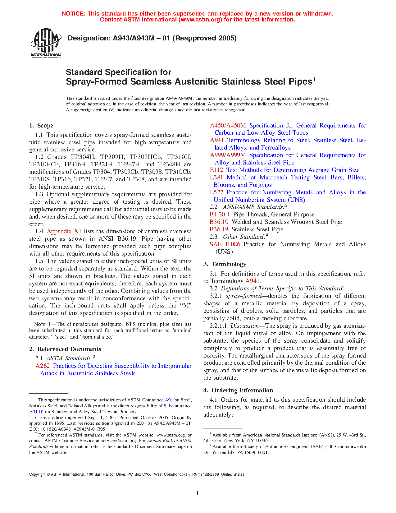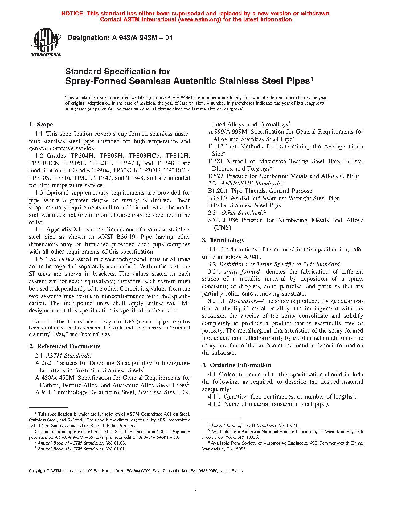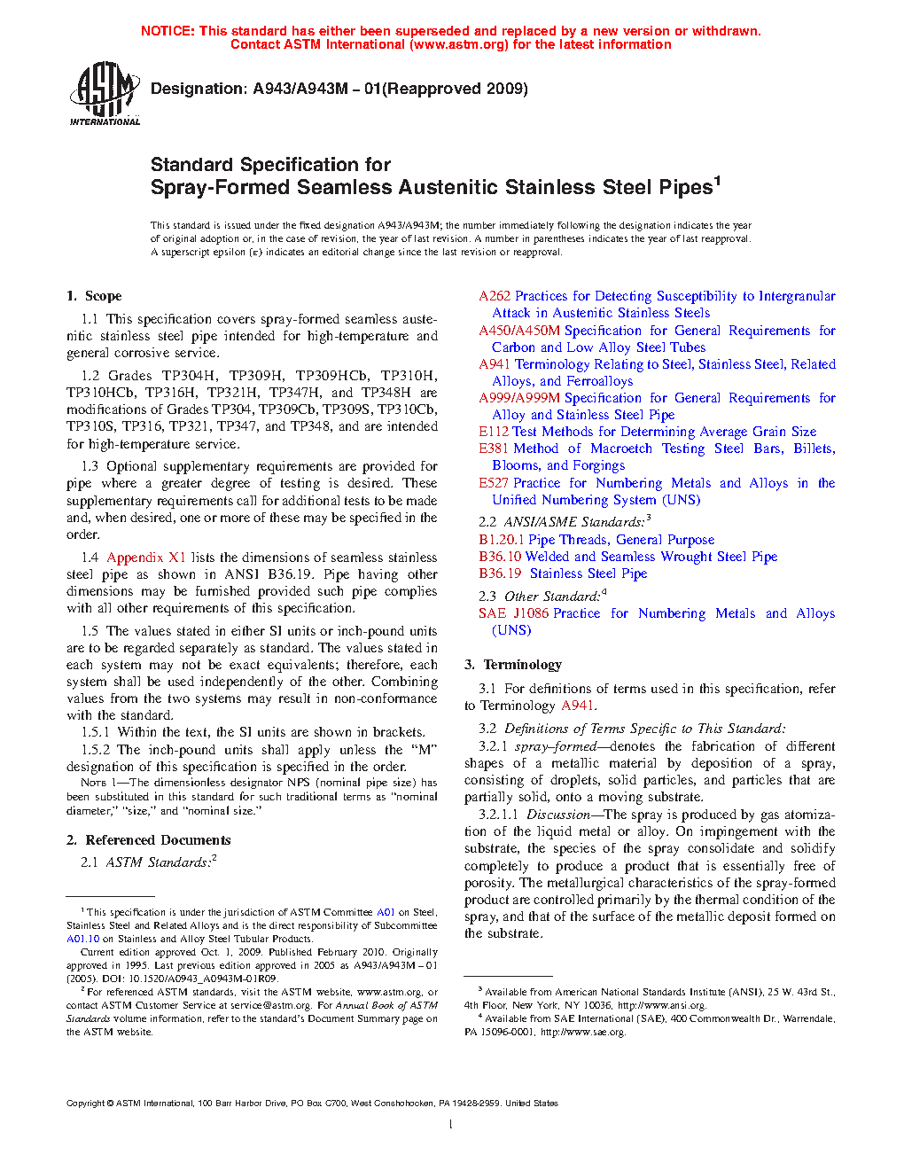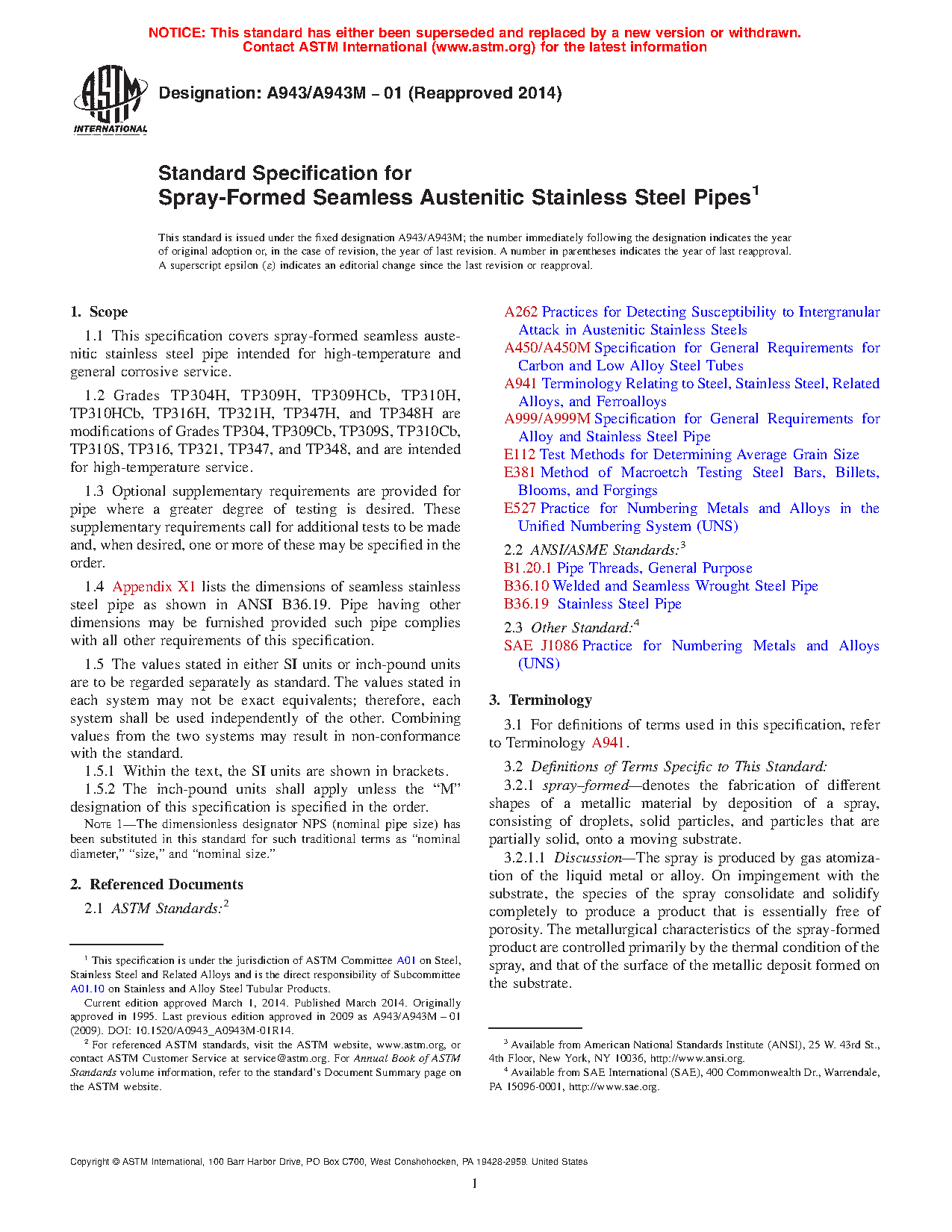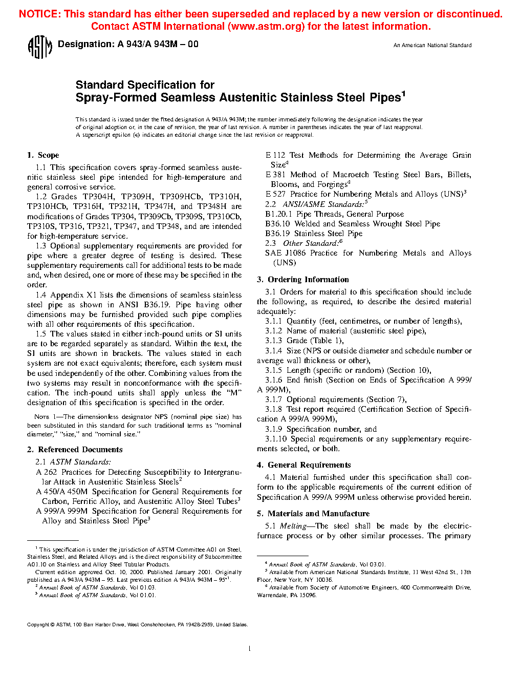 This specification covers spray-formed seamless austenitic stainless steel pipe intended for high-temperature and general corrosive service. The steel shall conform to the specified chemical composition and tensile requirements. The mechanical test requirement includes, transverse or longitudinal tension test, flattening test, hydrostatic test and grain size determination are presented. One tension tests shall be made on a specimen for lots of more than 100 pipes. For material heat treated in a batch-typed furnace, flattening tests shall be made on 5% of the pipe from each heat treated lot. Each length of finished pipe shall be subjected to hydrostatic tests.