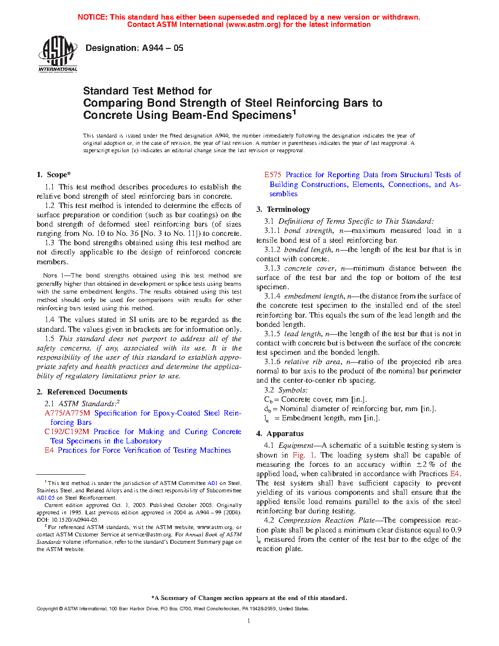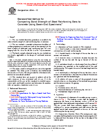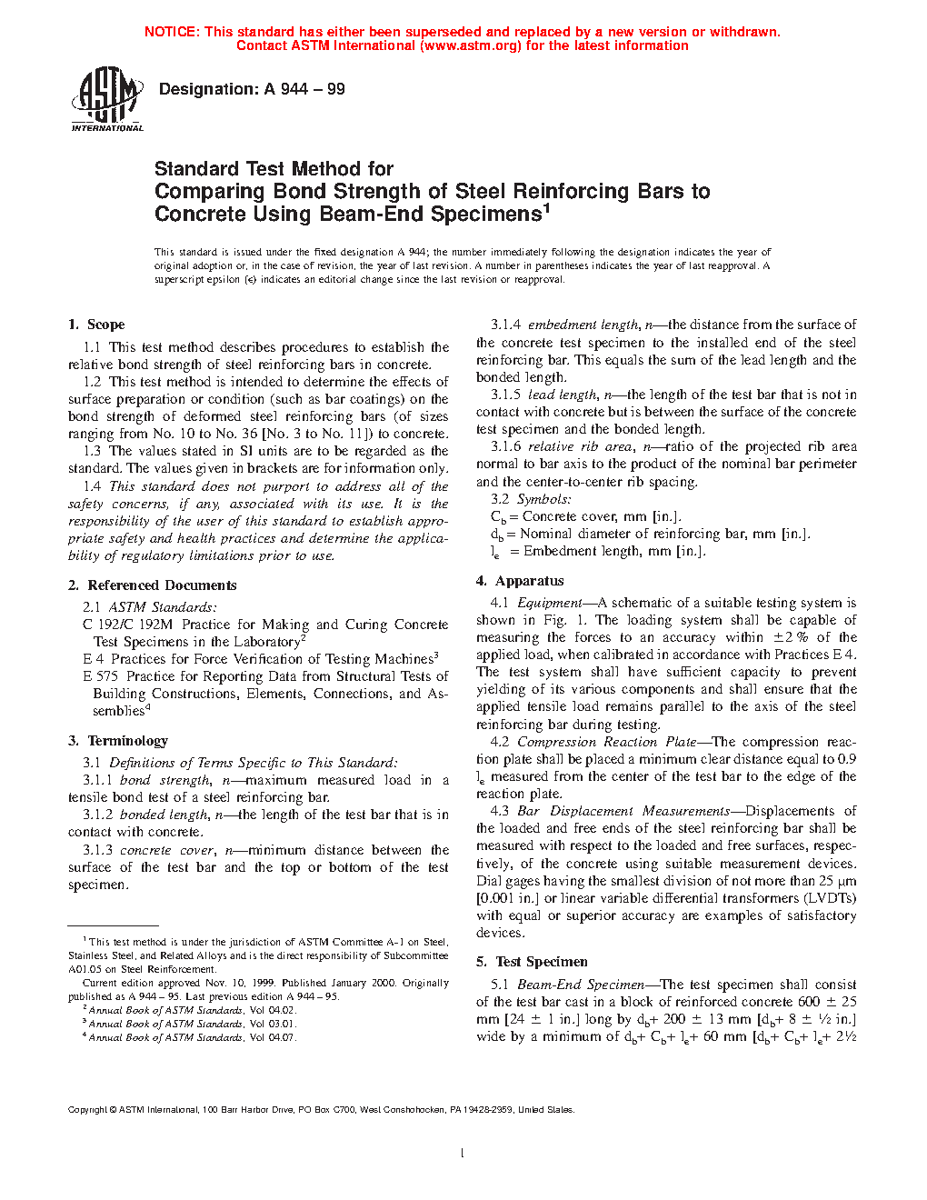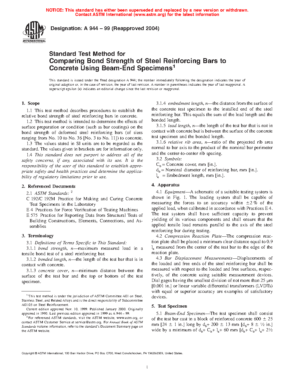 This test method deals with the standard procedures for establishing the relative bond strength of steel reinforcing bars in concrete using beam-end specimens. This test method shall determine the effects of surface preparation or condition (such as bar coatings) on the bond strength of deformed steel reinforcing bars to concrete. The bond strengths obtained using this test method shall not be directly applicable to the design of reinforced concrete members. The beam-end test specimen shall be fabricated by casting, and conditioned by curing prior to tensile load test. The test system shall consist of the loading system, compression reaction plate, and bar displacement measurement device.