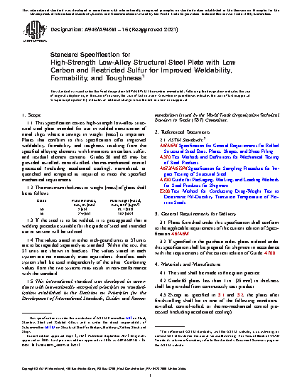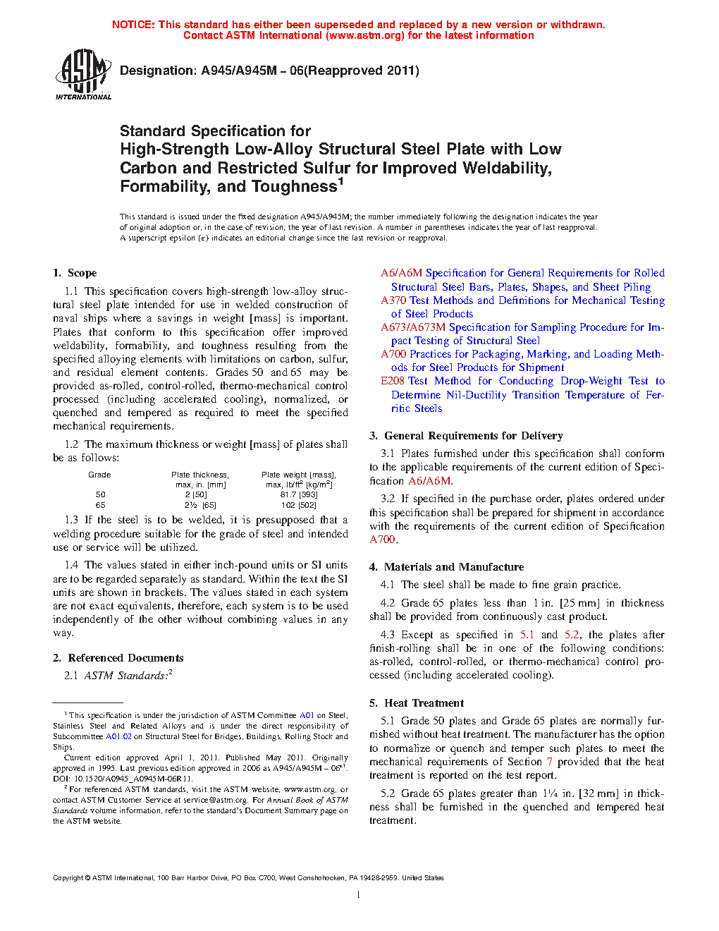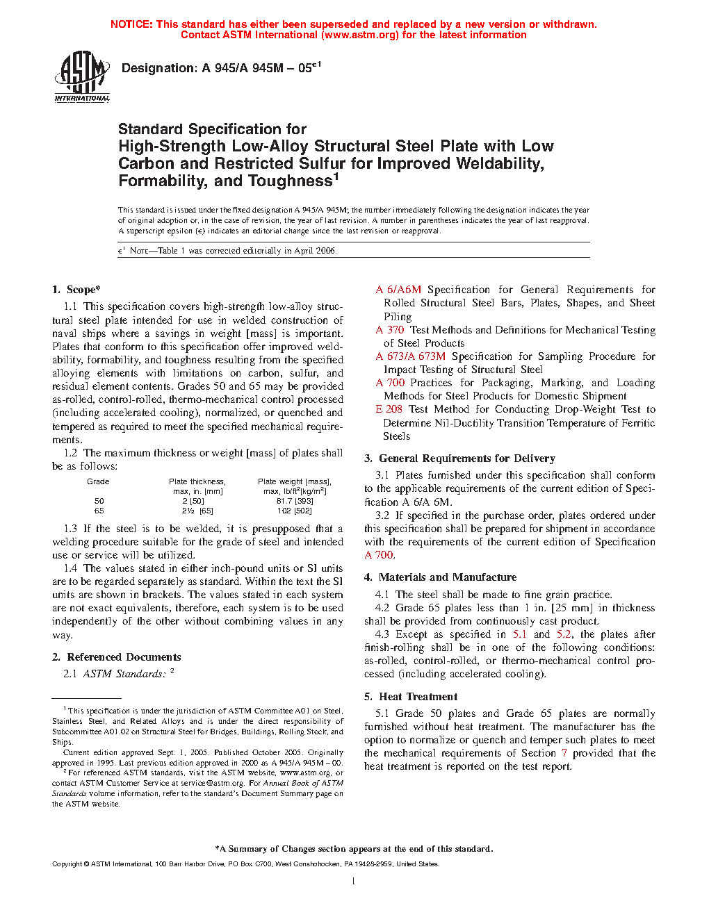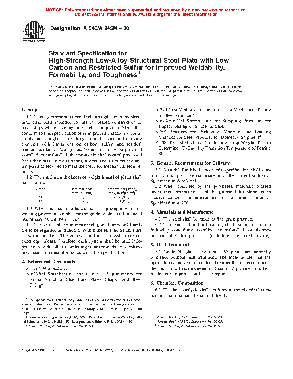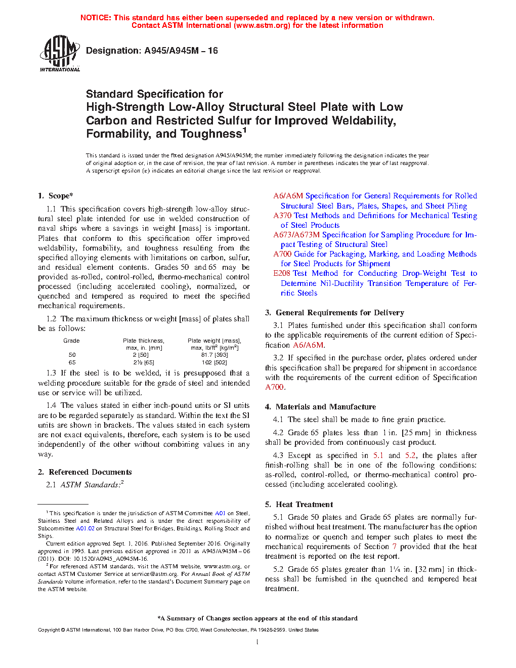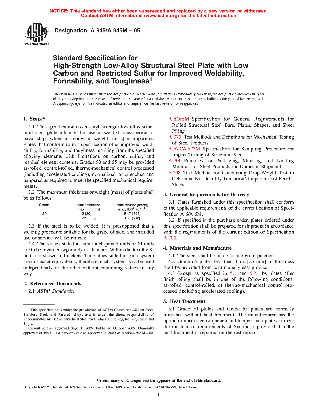 1.1 This specification covers high-strength low-alloy structural steel plate intended for use in welded construction of naval ships where a savings in weight [mass] is important. Plates that conform to this specification offer improved weldability, formability, and toughness resulting from the specified alloying elements with limitations on carbon, sulfur, and residual element contents. Grades 50 and 65 may be provided as-rolled, control-rolled, thermo-mechanical control processed (including accelerated cooling), normalized, or quenched and tempered as required to meet the specified mechanical requirements.