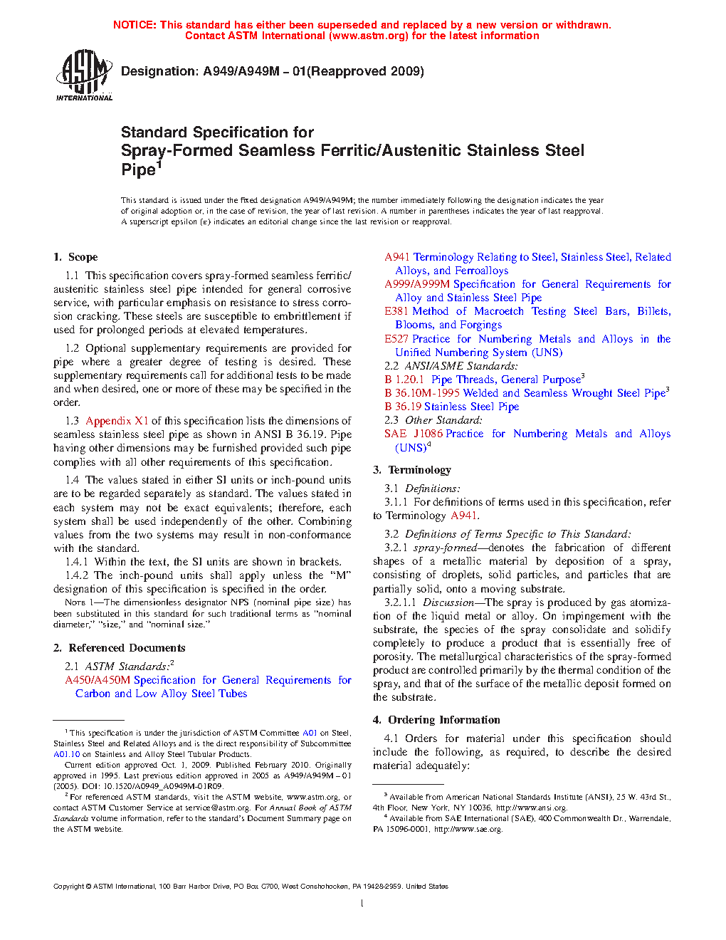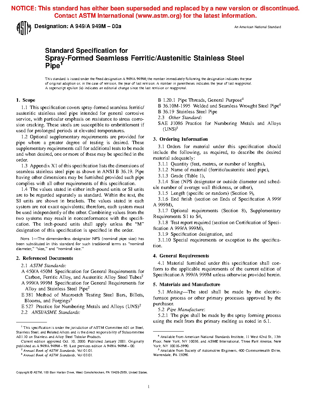 This specification covers spray-formed seamless ferritic/austenitic stainless steel pipe intended for general corrosive service, with particular emphasis on resistance to stress corrosion cracking. These steels are susceptible to embrittlement if used for prolonged periods at elevated temperatures. The steel shall be made by the electric-furnace process and the pipe shall be made by the spray forming process using the melt from the primary melting. The as spray formed tubes shall be machined on both the inner and outer surfaces. All pipes shall be furnished in the heat-treated and descaled conditions. These pipes shall be free of contaminating iron particles. The specimens shall undergo transverse or longitudinal tension test, flattening test and hydrostatic test.