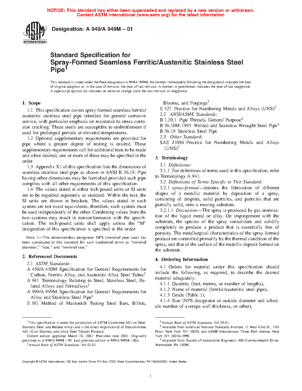 1.1 This specification covers spray-formed seamless ferritic/austenitic stainless steel pipe intended for general corrosive service, with particular emphasis on resistance to stress corrosion cracking. These steels are susceptible to embrittlement if used for prolonged periods at elevated temperatures.