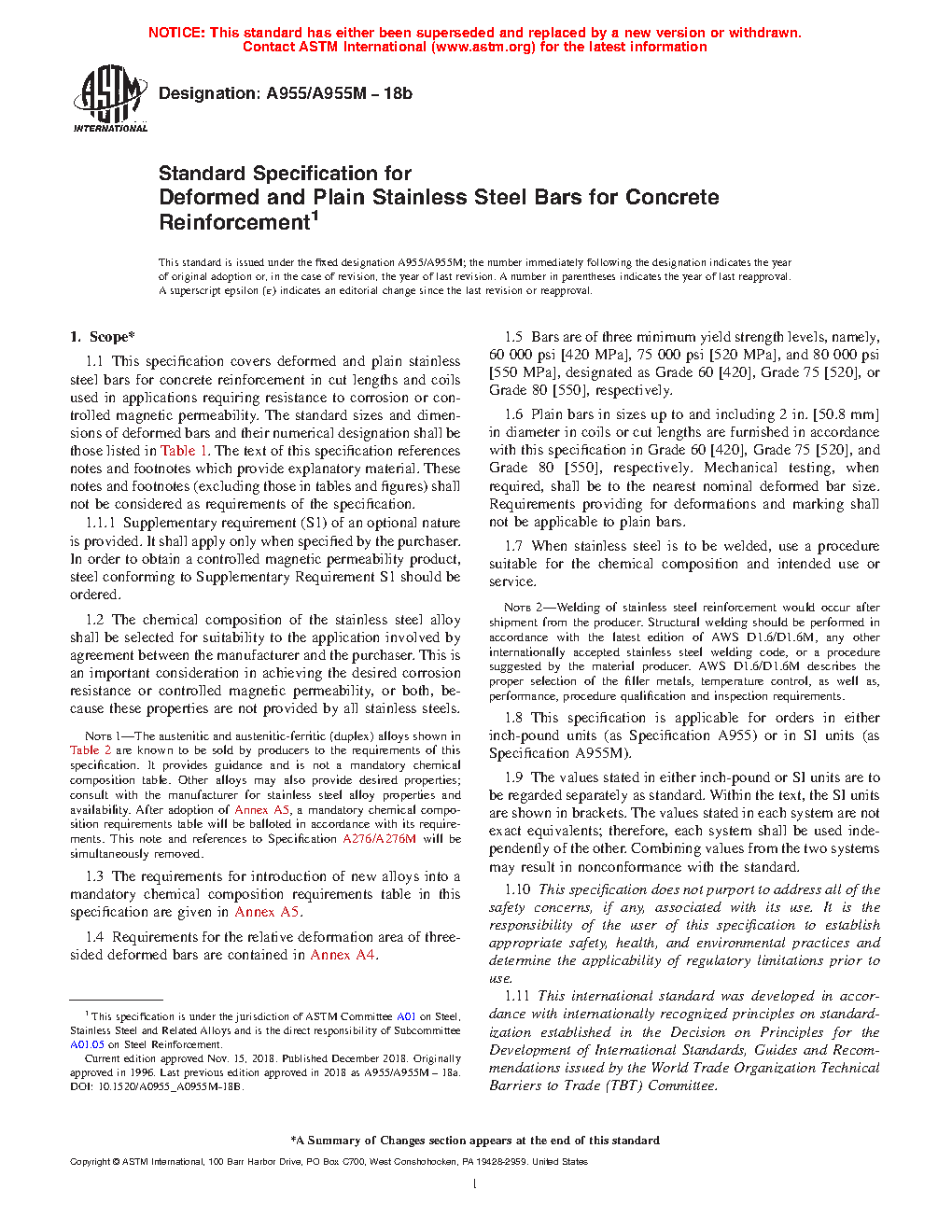 1.1 This specification covers deformed and plain stainless steel bars for concrete reinforcement used in applications requiring resistance to corrosion or controlled magnetic permeability. The standard sizes and dimensions of deformed bars and their numerical designation shall be those listed in . The text of this specification references notes and footnotes which provide explanatory material. These notes and footnotes (excluding those in tables and figures) shall not be considered as requirements of the specification.