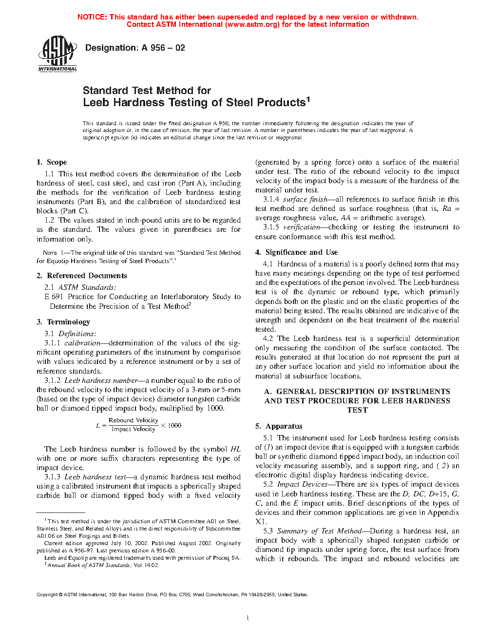 1.1 This test method covers the determination of the Leeb hardness of steel, cast steel, and cast iron (Part A), including the methods for the verification of Leeb hardness testing instruments (Part B), and the calibration of standardized test blocks (Part C).