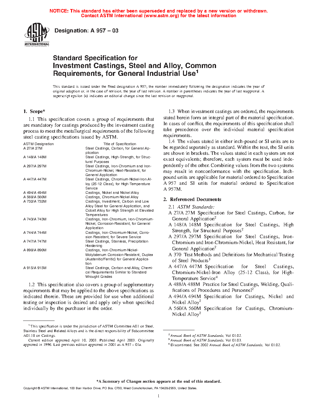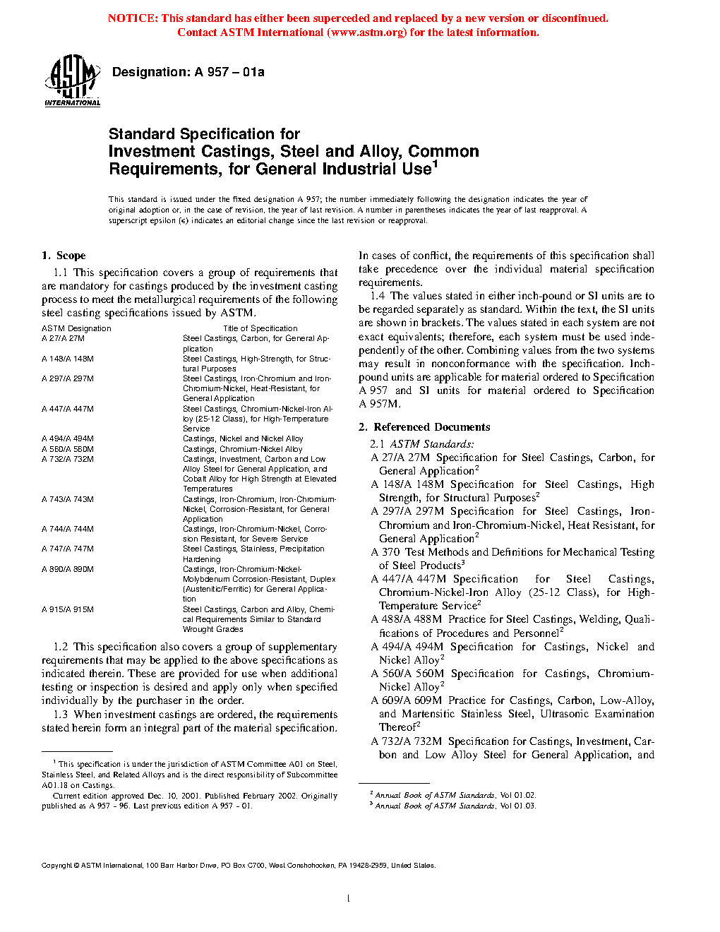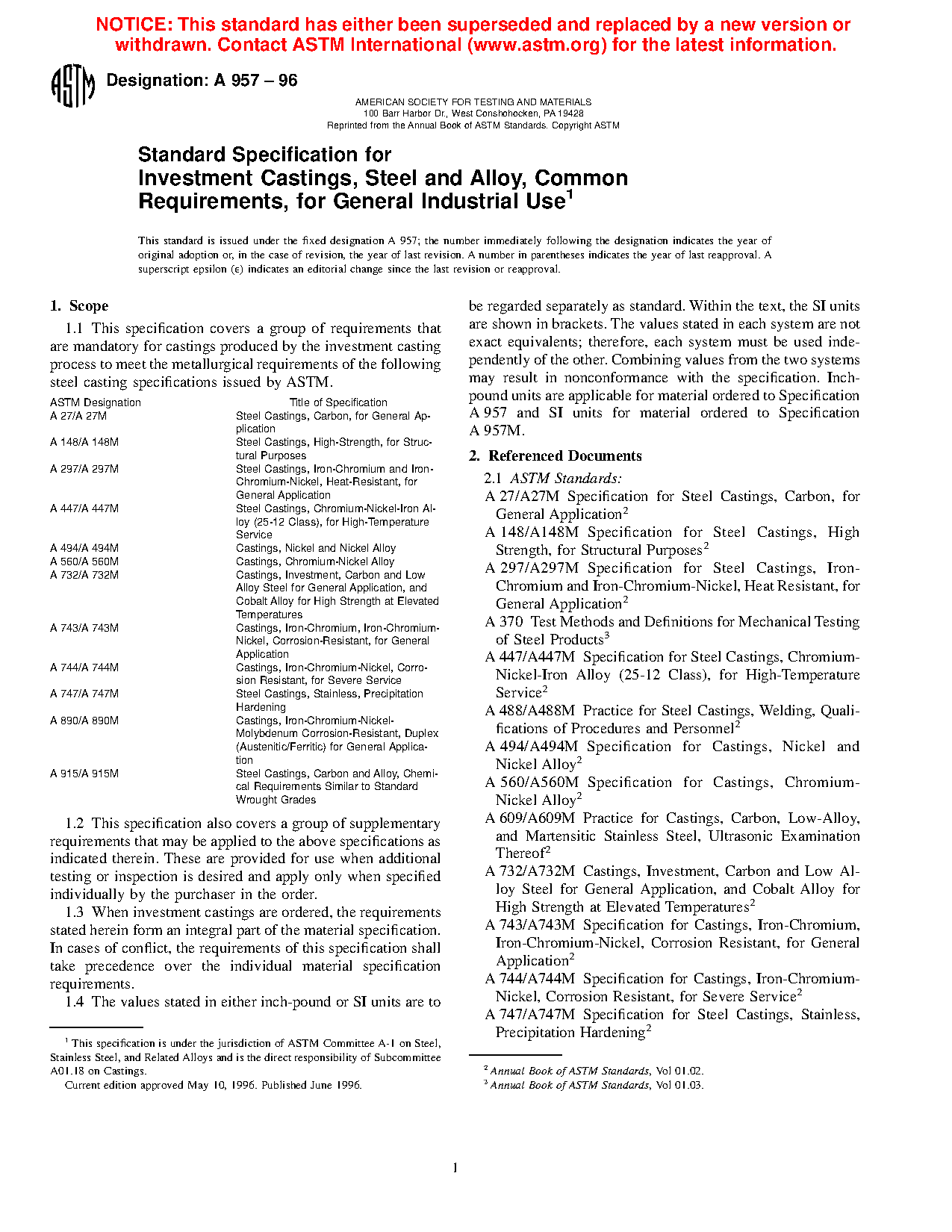 | A 743/A 743M | Castings, Iron-Chromium, Iron-Chromium-Nickel, Corrosion-Resistant, for General Application |