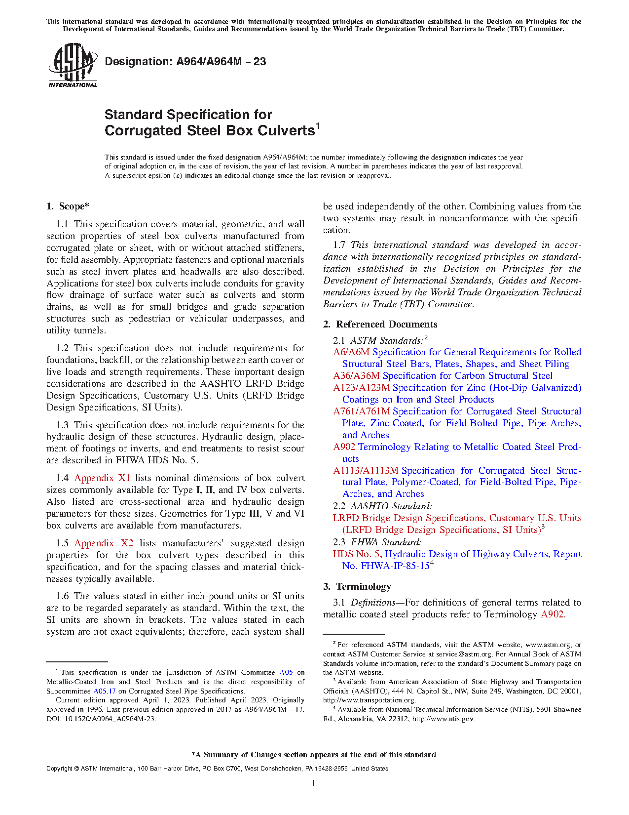 1.3 This specification does not include requirements for the hydraulic design of these structures. Hydraulic design, placement of footings or inverts, and end treatments to resist scour are described in FHWA HDS No. 5.