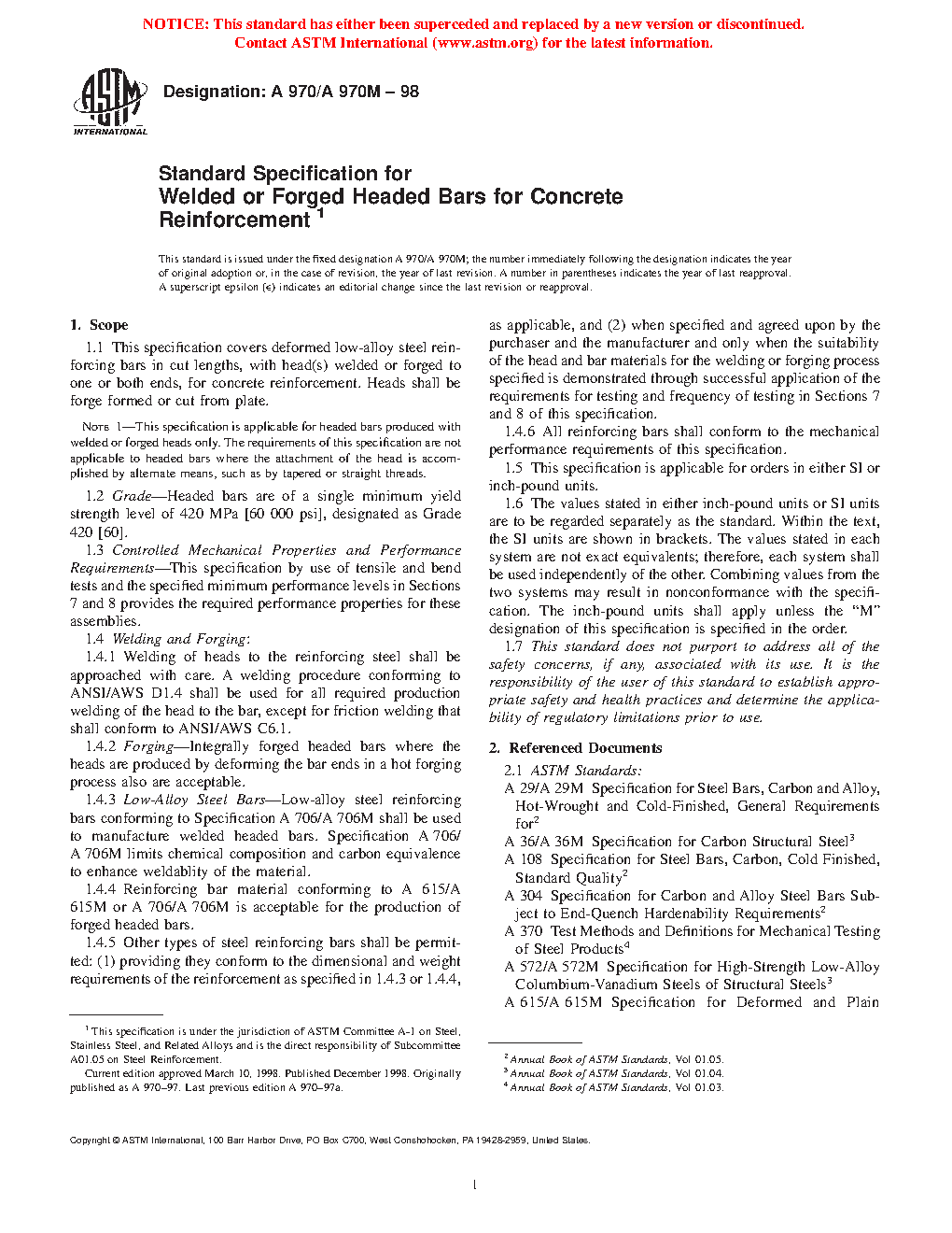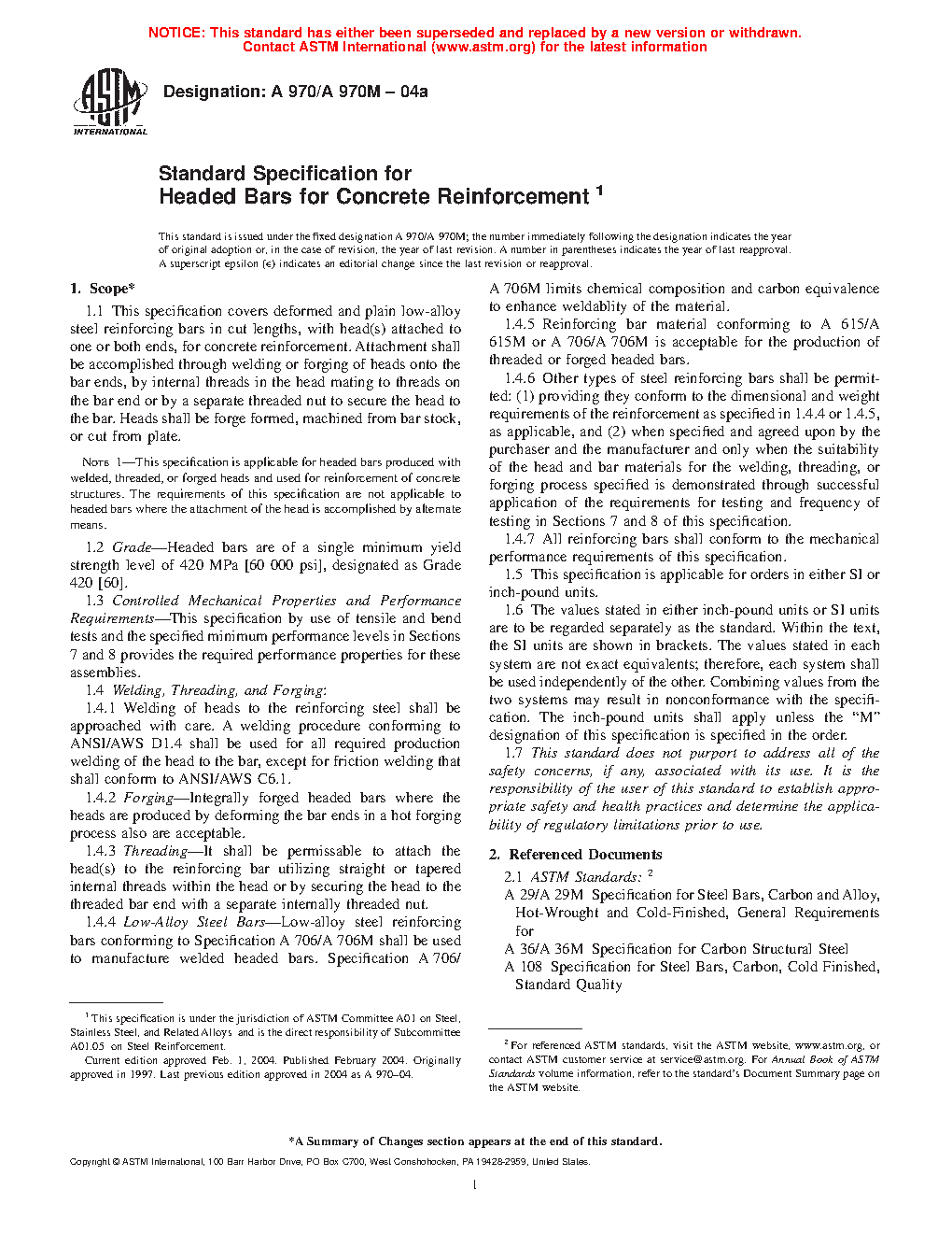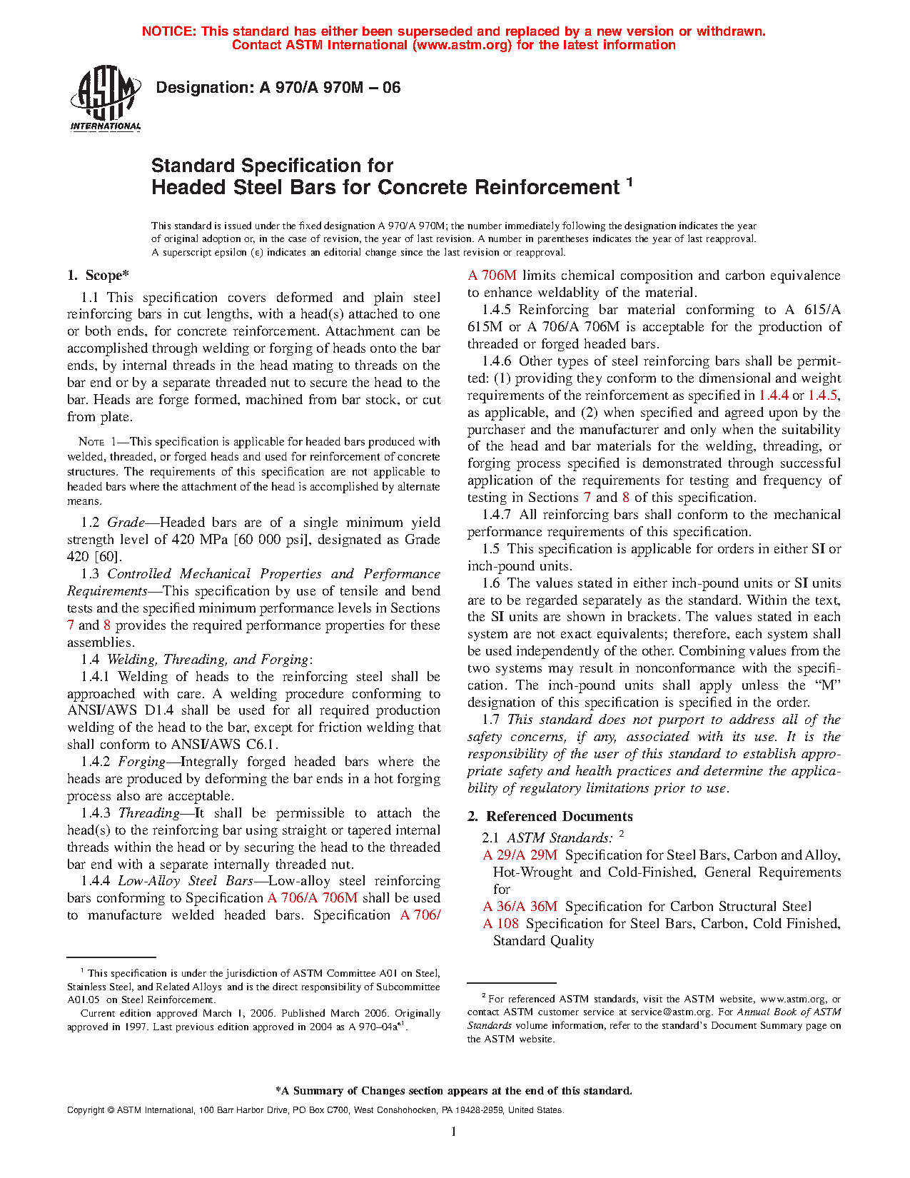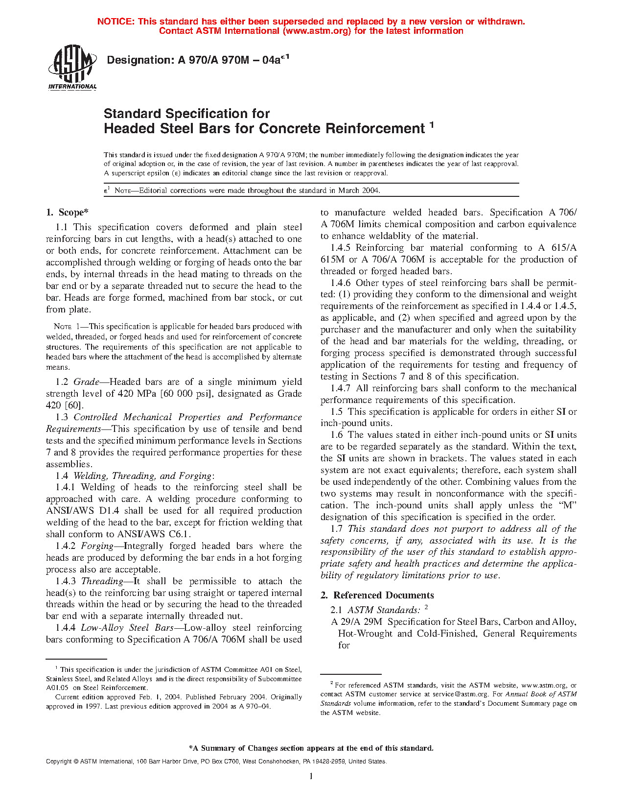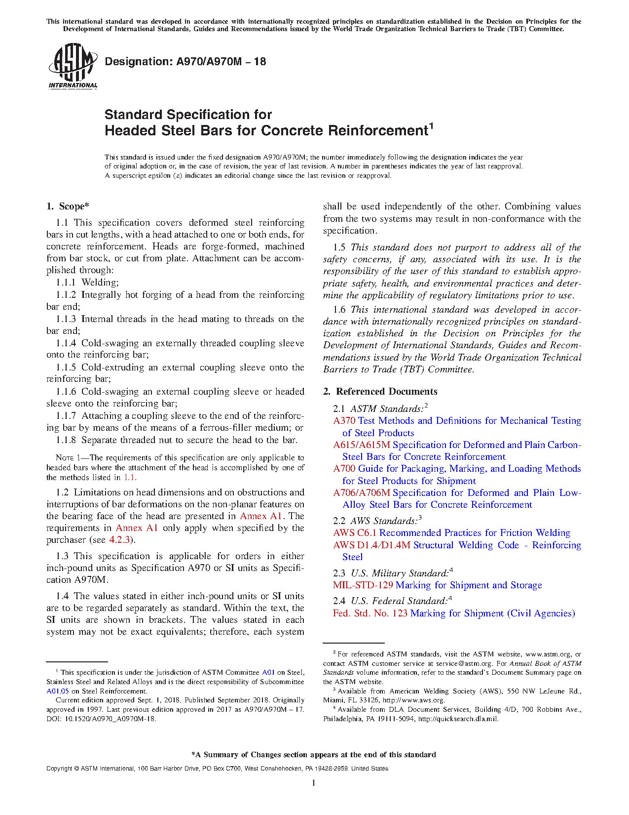 1.1 This specification covers deformed and plain steel reinforcing bars in cut lengths, witha head(s) attached to one or both ends, for concrete reinforcement. Attachment can be accomplished through welding or forging of heads onto the bar ends, by internal threads in the head mating to threads on the bar end or by a separate threaded nut to secure the head to the bar. Heads are forge formed, machined from bar stock, or cut from plate.
