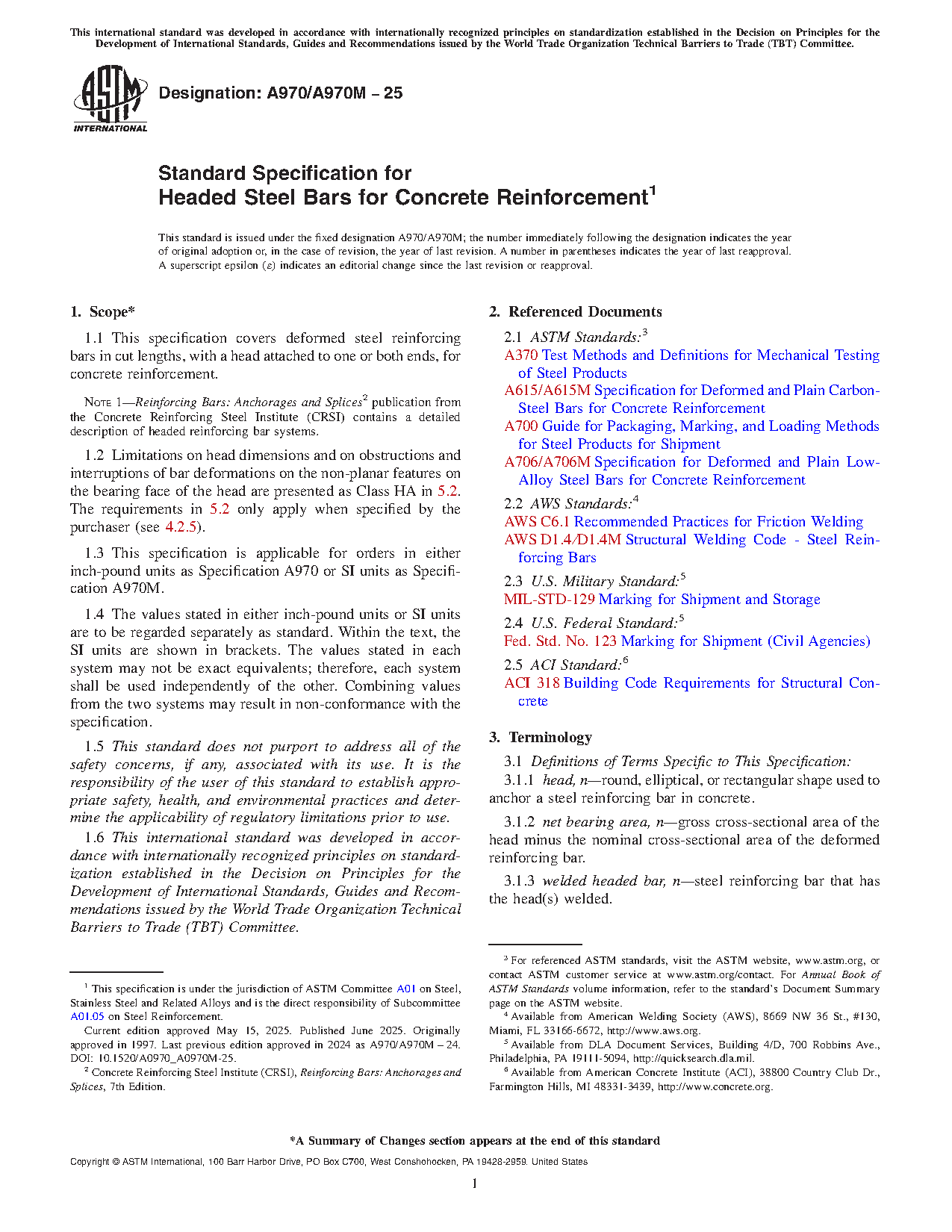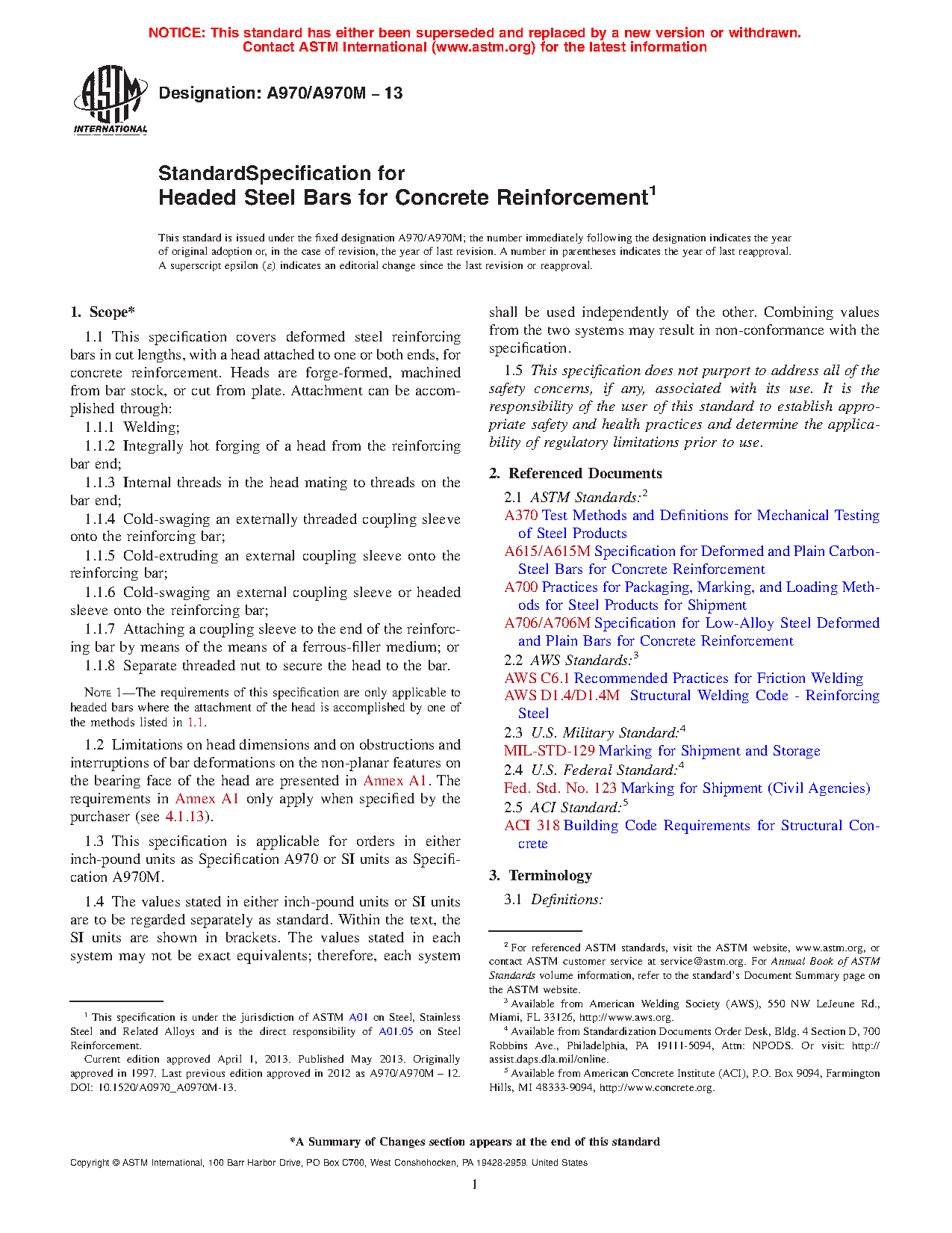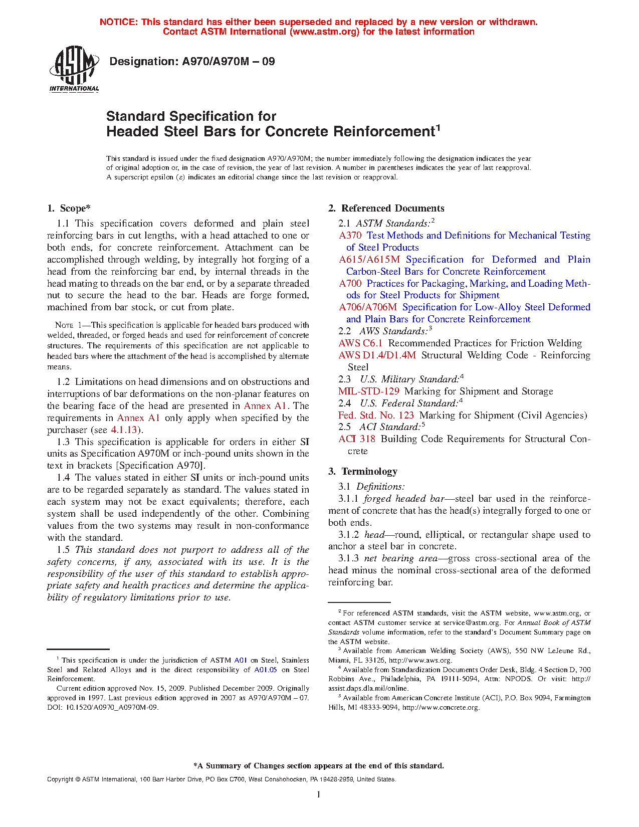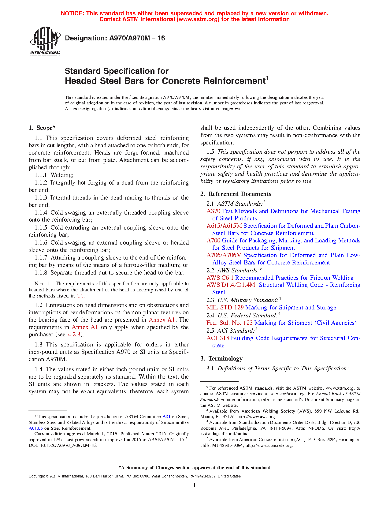 Note 1—This specification is applicable for headed bars produced with welded, threaded, or forged heads and used for reinforcement of concrete structures. The requirements of this specification are not applicable to headed bars where the attachment of the head is accomplished by alternate means.