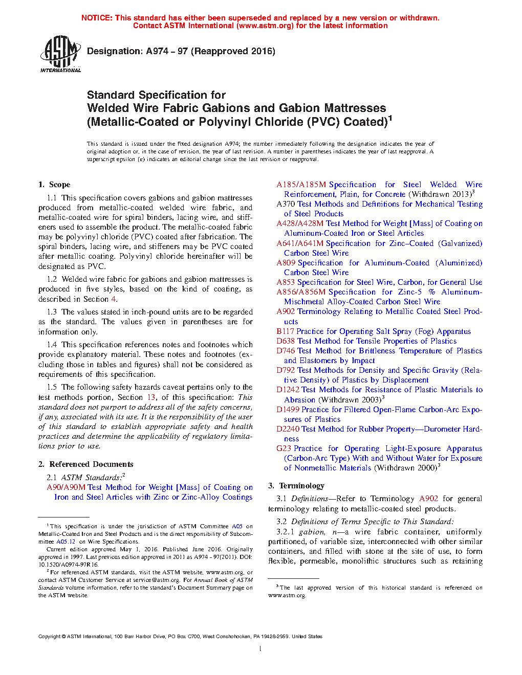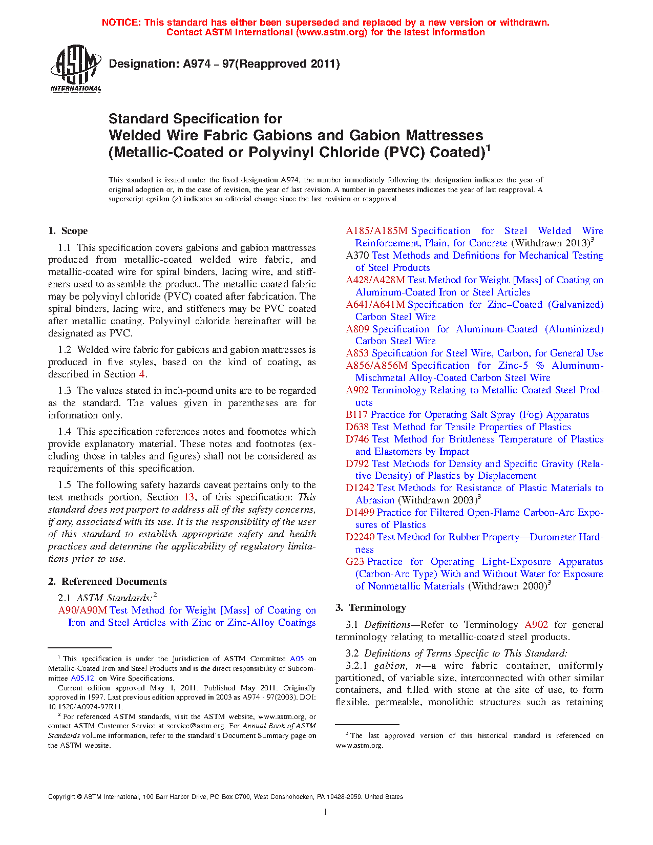 1.1 This specification covers gabions and gabion mattresses produced from metallic-coated welded wire fabric, and metallic-coated wire for spiral binders, lacing wire, and stiffeners used to assemble the product. The metallic-coated fabric may be polyvinyl chloride (PVC) coated after fabrication. The spiral binders, lacing wire, and stiffeners may be PVC coated after metallic coating. Polyvinyl chloride hereinafter will be designated as PVC.