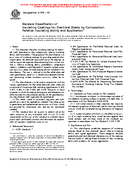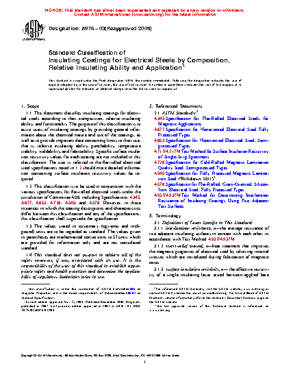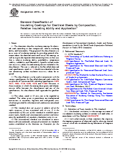 1.1 This document classifies insulating coatings for electrical steels according to their composition, relative insulating ability, and functionality. The purpose of this classification is to assist users of insulating coatings by providing general information about the chemical nature and use of the coatings, as well as to provide important data concerning limits to their use, that is, relative insulating ability, punchability, temperature stability, weldability, and fabricability. Specific surface insulation resistivity values for each coating are not included in this classification. The user is referred to the flat-rolled electrical steel specifications noted in 1.2 should more detailed information concerning surface insulation resistivity values be required.