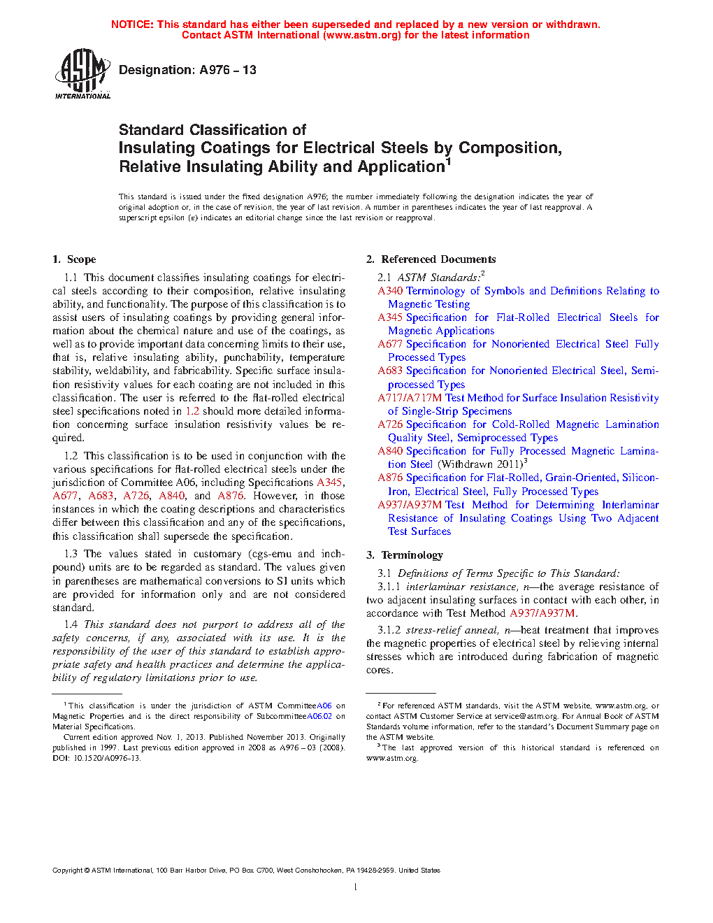1.2 This classification is to be used in conjunction with the various specifications for flat-rolled electrical steels under the jurisdiction of Committee A06, including Specifications A345, A677, A683, A726, A840, A876, and A1086. However, in those instances in which the coating descriptions and characteristics differ between this classification and any of the specifications, this classification shall supersede the specification.