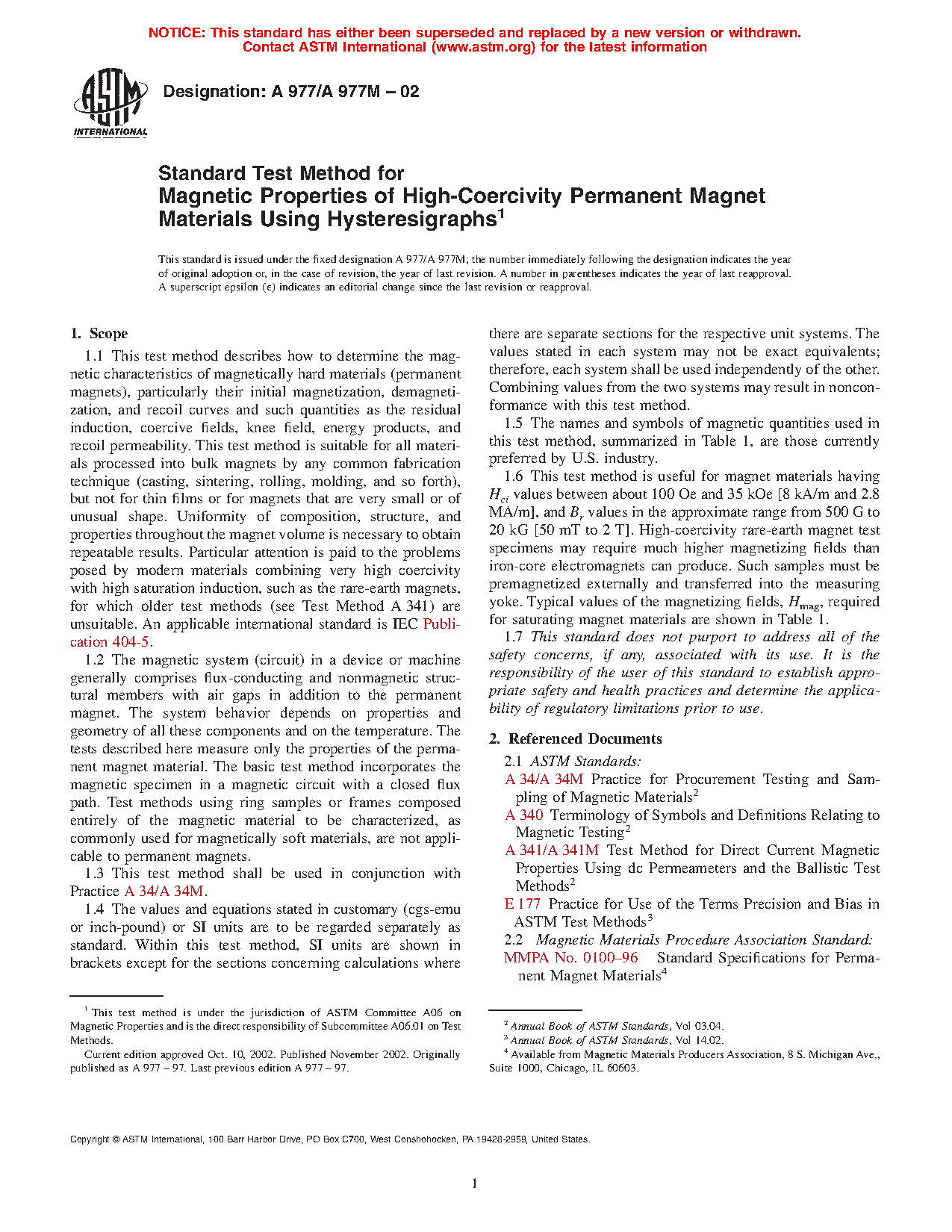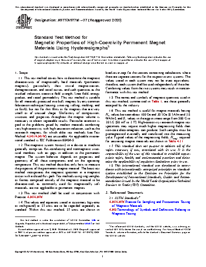 1.1 This test method covers how to determine the magnetic characteristics of magnetically hard materials (permanent magnets), particularly their initial magnetization, demagnetization, and recoil curves, and such quantities as the residual induction, coercive field strength, knee field, energy product, and recoil permeability. This test method is suitable for all materials processed into bulk magnets by any common fabrication technique (casting, sintering, rolling, molding, and so forth), but not for thin films or for magnets that are very small or of unusual shape. Uniformity of composition, structure, and properties throughout the magnet volume is necessary to obtain repeatable results. Particular attention is paid to the problems posed by modern materials combining very high coercivity with high saturation induction, such as the rare-earth magnets, for which older test methods (see Test Method A341/A341M) are unsuitable. An applicable international standard is IEC Publication 60404-5.