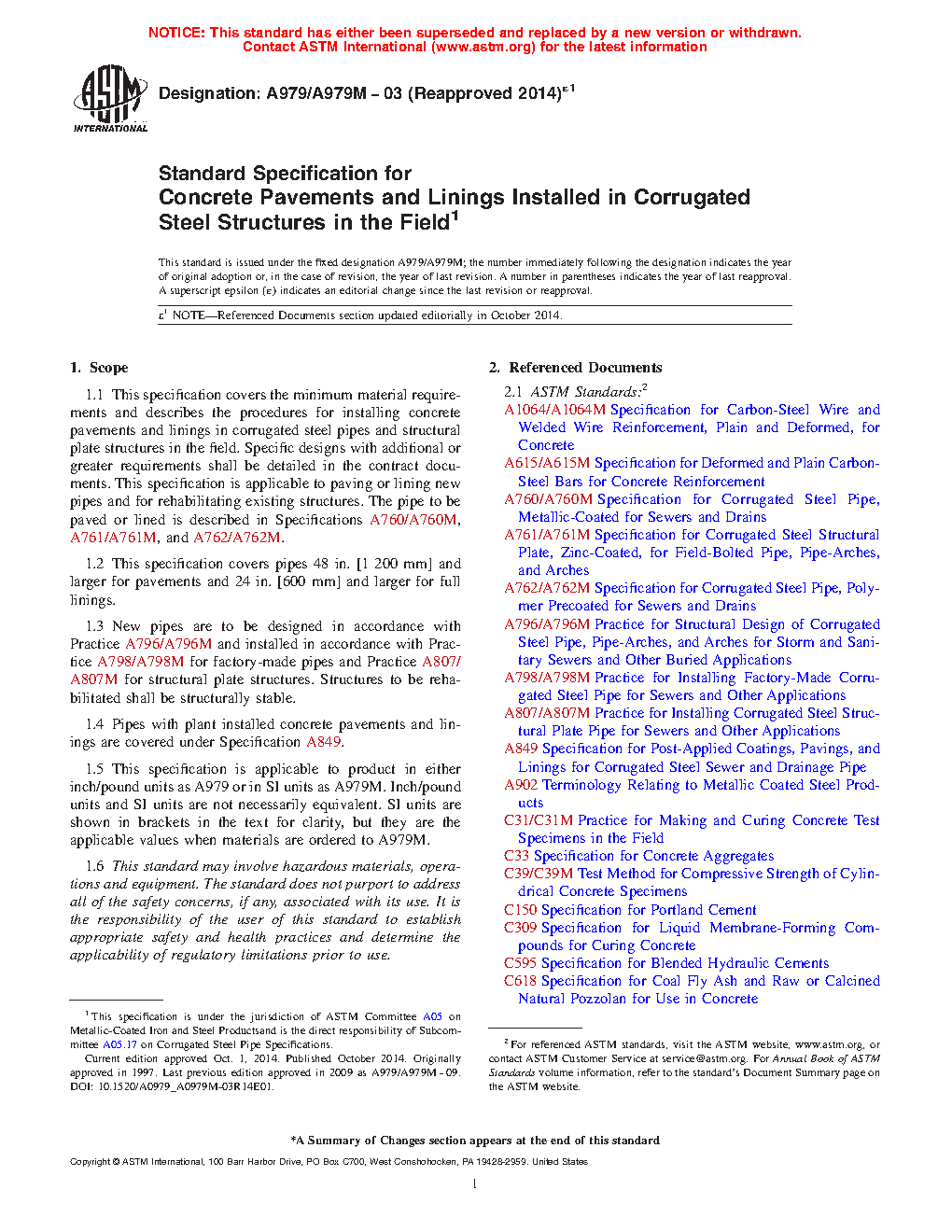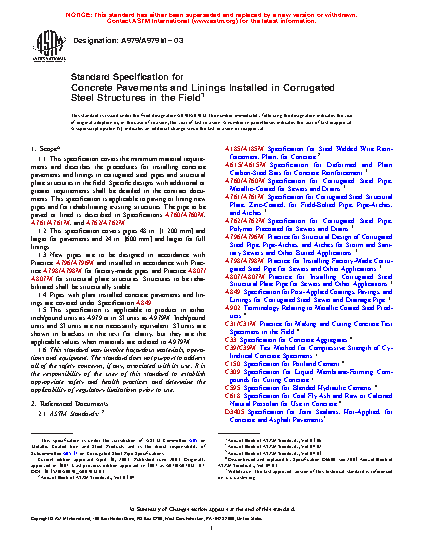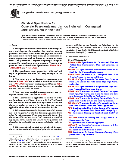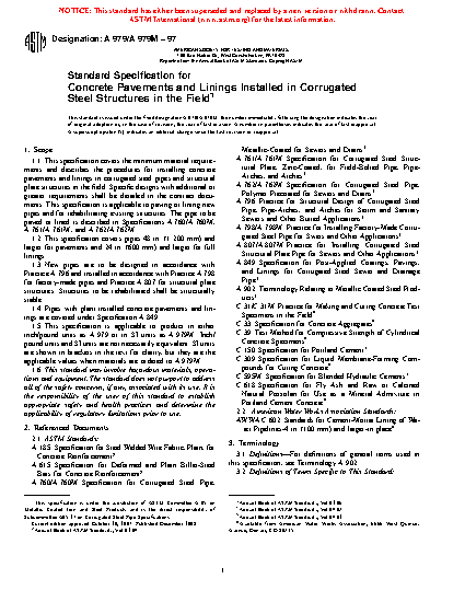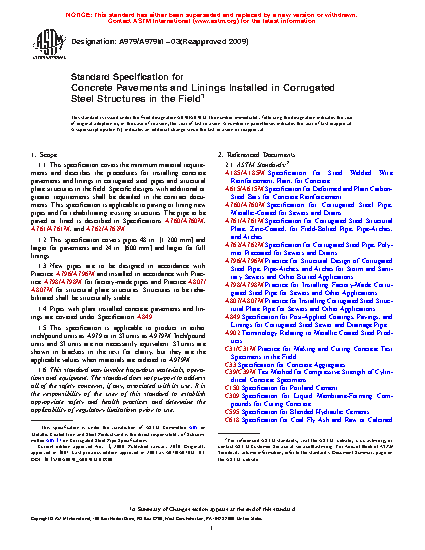 1.1 This specification covers the minimum material requirements and describes the procedures for installing concrete pavements and linings in corrugated steel pipes and structural plate structures in the field. Specific designs with additional or greater requirements shall be detailed in the contract documents. This specificaiton is applicable to paving or lining new pipes and for rehabilitating existing structures. The pipe to be paved or lined is described in Specifications A 760/A 760M, A 761/A 761M, and A 762/A 762M.