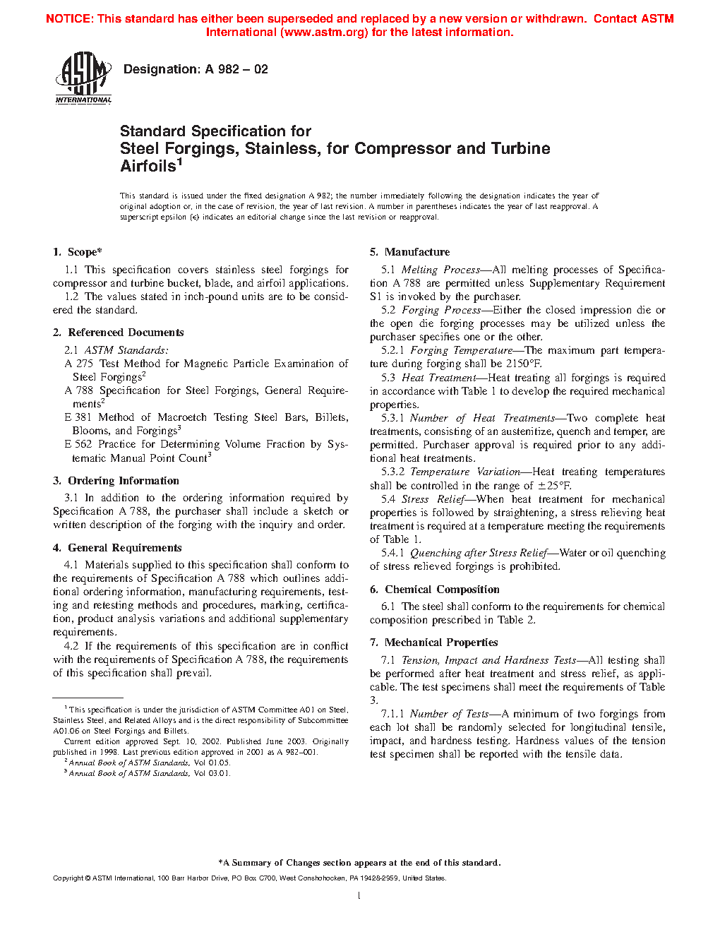 1.1 This specification covers stainless steel forgings for compressor and turbine bucket, blade, and airfoil applications.