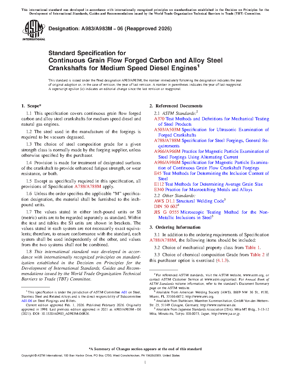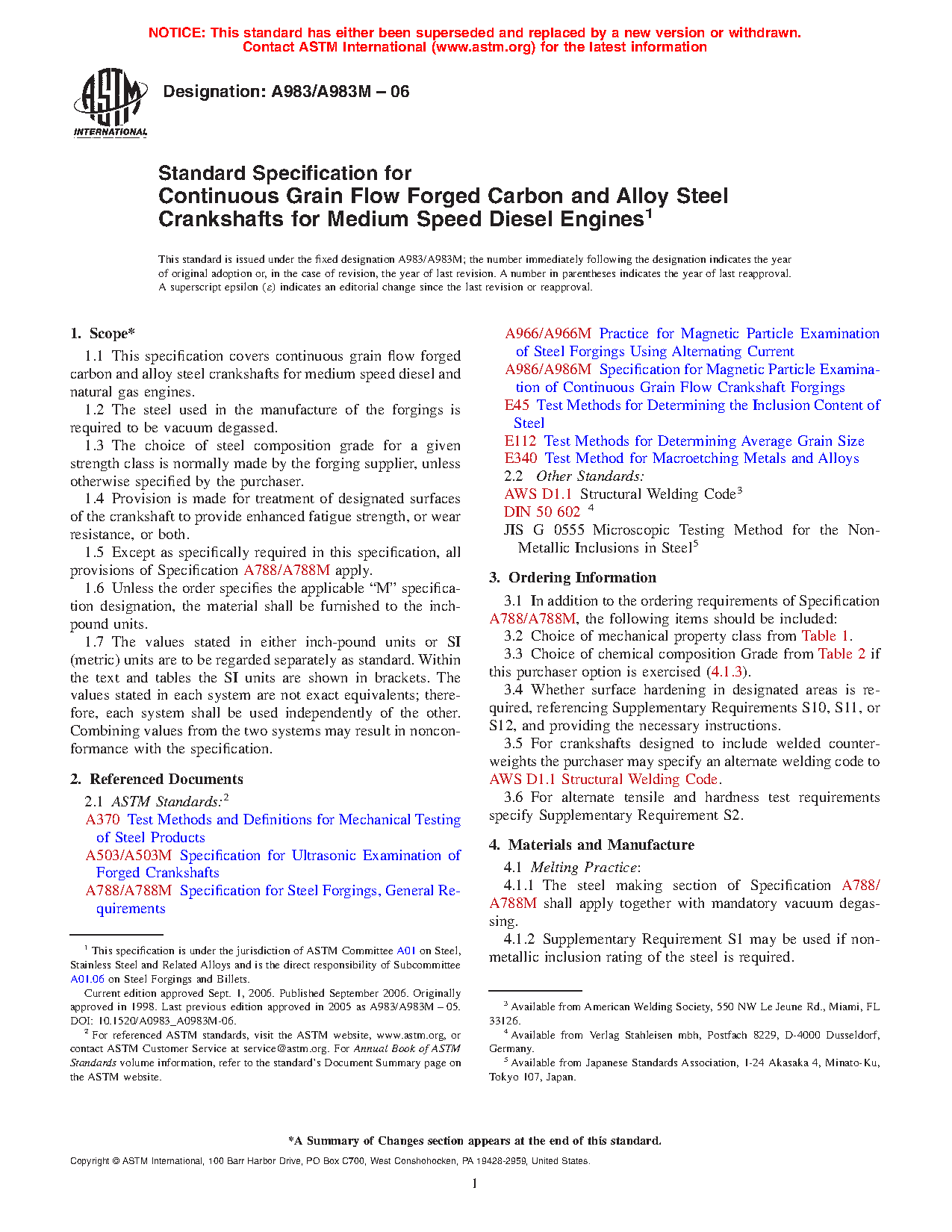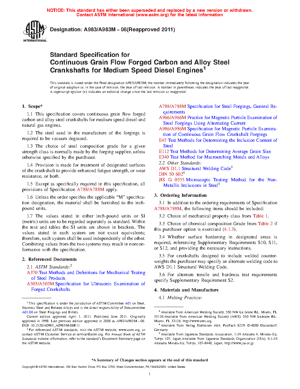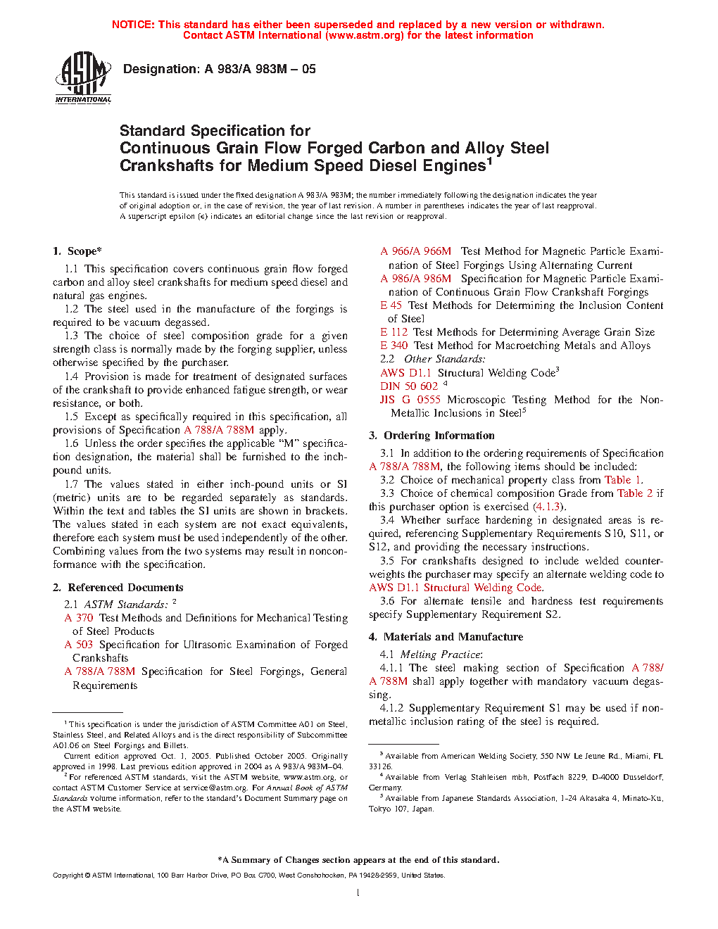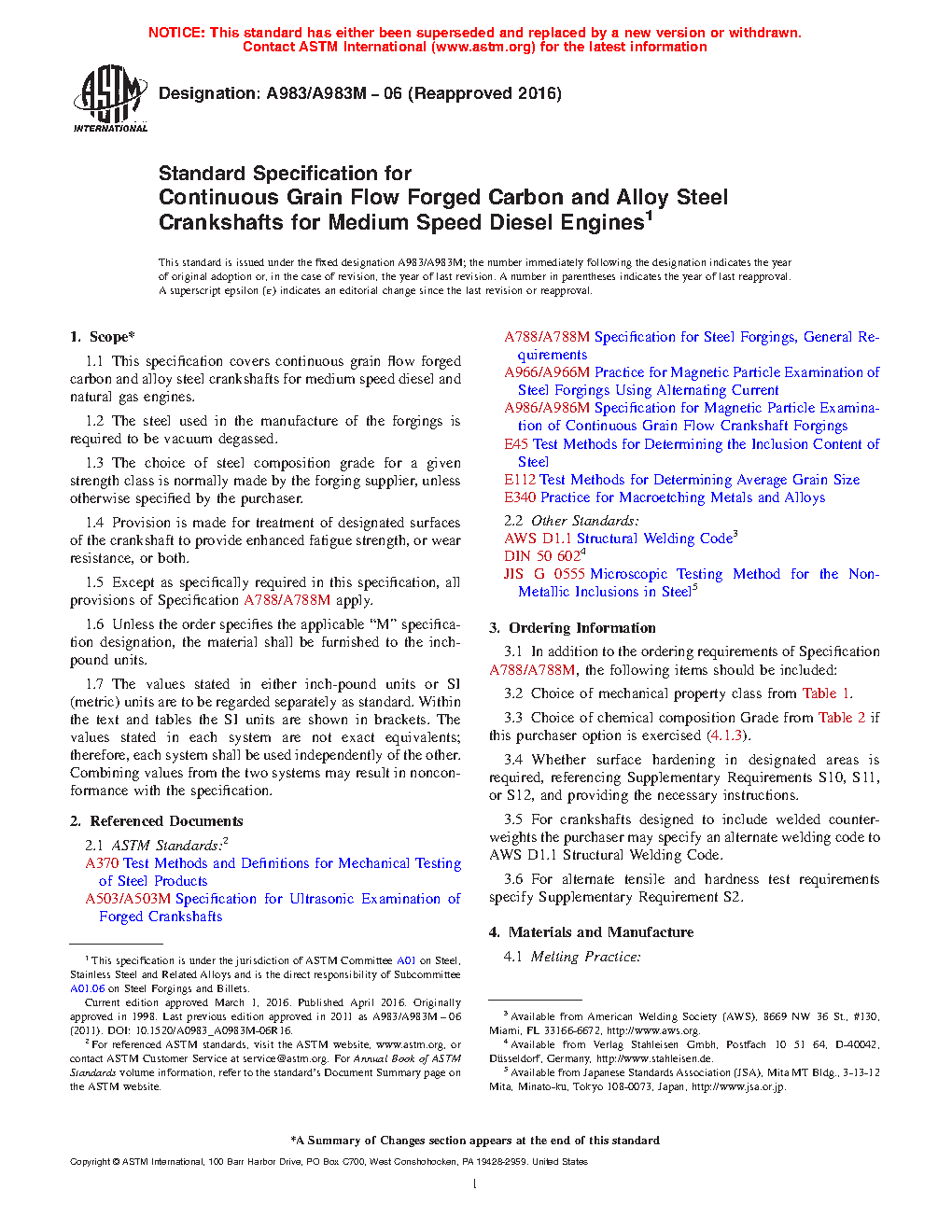 1.1 This specification covers continuous grain flow forged carbon and alloy steel crankshafts for medium speed diesel and natural gas engines.